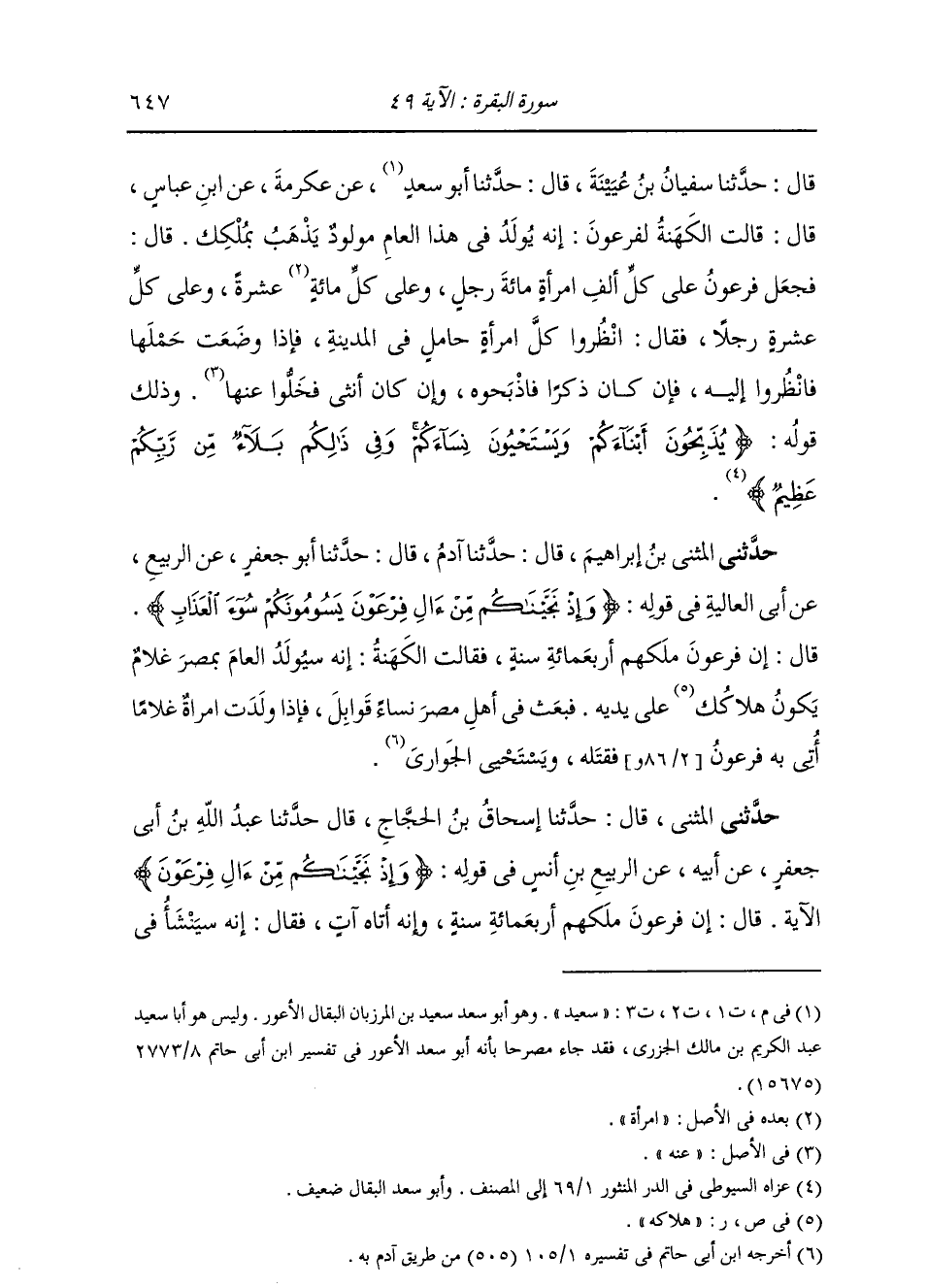 حَدَّثَنِي الْمُثَنَّى بْنُ إِبْرَاهِيمَ، قَالَ: حَدَّثَنَا آدَمُ، قَالَ: حَدَّثَنَا أَبُو جَعْفَرٍ، عَنِ الرَّبِيعِ، عَنْ أَبِي الْعَالِيَةِ: " فِي قَوْلِهِ: {§وَإِذْ نَجَّيْنَاكُمْ مِنْ آلِ فِرْعَوْنَ يَسُومُونَكُمْ سُوءَ الْعَذَابِ} [البقرة: 49] قَالَ: إِنَّ فِرْعَوْنَ مَلَكَهُمْ أَرْبَعَمِائَةِ سَنَةٍ، فَقَالَتِ الْكَهَنَةُ: إِنَّهُ سَيُولَدُ الْعَامَ بِمِصْرَ غُلَامٌ يَكُونُ هَلَاكُكَ عَلَى يَدَيْهِ. فَبَعَثَ فِي أَهْلِ مِصْرَ نِسَاءً قَوَابِلَ، فَإِذَا وَلَدَتِ امْرَأَةٌ غُلَامًا أُتِيَ بِهِ فِرْعَوْنُ فَقَتَلَهُ وَيَسْتَحْيِي الْجَوَارِي " وَحَدَّثَنِي الْمُثَنَّى، قَالَ: حَدَّثَنَا إِسْحَاقُ بْنُ الْحَجَّاجِ، قَالَ: حَدَّثَنَا عَبْدُ اللَّهِ بْنُ أَبِي جَعْفَرٍ، عَنْ أَبِيهِ، عَنِ الرَّبِيعِ بْنِ أَنَسٍ: " فِي قَوْلِهِ: {وَإِذْ نَجَّيْنَاكُمْ مِنْ آلِ فِرْعَوْنَ} [البقرة: 49] الْآيَةُ، قَالَ: إِنَّ فِرْعَوْنَ مَلَكَهُمْ أَرْبَعَمِائَةِ سَنَةٍ، وَإِنَّهُ أَتَاهُ آتٍ، فَقَالَ: إِنَّهُ سَيَنْشَأُ فِي -[648]- مِصْرَ غُلَامٌ مِنْ بَنِي إِسْرَائِيلَ فَيَظْهَرُ عَلَيْكَ وَيَكُونُ هَلَاكُكَ عَلَى يَدَيْهِ. فَبَعَثَ فِي مِصْرَ نِسَاءً " فَذَكَرَ نَحْوَ حَدِيثِ آدَمَ