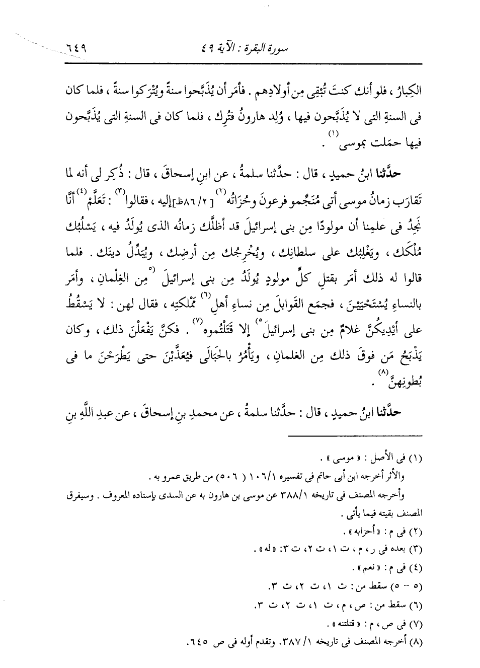 حَدَّثَنَا مُحَمَّدُ بْنُ حُمَيْدٍ، قَالَ: حَدَّثَنَا سَلَمَةُ، عَنِ ابْنِ إِسْحَاقَ، قَالَ: " ذُكِرَ لِي أَنَّهُ §لَمَّا تَقَارَبَ زَمَانُ مُوسَى أَتَى مُنَجِّمُو فِرْعَوْنَ وَحُزَاتُهُ إِلَيْهِ، فَقَالُوا لَهُ: تَعْلَمُ أَنَّا نَجِدُ فِي عِلْمِنَا أَنَّ مَوْلُودًا مِنْ بَنِي إِسْرَائِيلَ قَدْ أَظَلَّكَ زَمَانُهُ الَّذِي يُولَدُ فِيهِ، يَسْلُبُكَ مُلْكَكَ وَيَغْلِبُكَ عَلَى سُلْطَانِكَ، وَيُخْرِجُكَ مِنْ أَرْضِكَ، وَيُبَدِّلُ دِينَكَ. فَلَمَّا قَالُوا لَهُ ذَلِكَ، أَمَرَ بِقَتْلِ كُلِّ مَوْلُودٍ يُولَدُ مِنْ بَنِي إِسْرَائِيلَ مِنَ الْغِلْمَانِ، وَأَمَرَ بِالنِّسَاءِ يُسْتَحْيَيْنَ. فَجَمَعَ الْقَوَابِلَ مِنْ نِسَاءِ مَمْلَكَتِهِ، فَقَالَ لَهُنَّ: لَا يَسْقُطْنَ عَلَى أَيْدِيكُنَّ غُلَامٌ مِنْ بَنِي إِسْرَائِيلَ إِلَّا قَتَلْتُنَّهُ. فَكُنَّ يَفْعَلْنَ ذَلِكَ، وَكَانَ يَذْبَحُ مَنْ فَوْقَ ذَلِكَ مِنَ الْغِلْمَانِ، وَيَأْمُرُ بِالْحَبَالَى فَيُعَذَّبْنَ حَتَّى يَطْرَحْنَ مَا فِي بُطُونِهِنَّ "