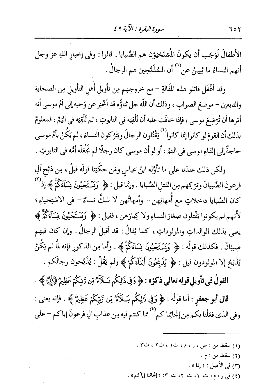 الْأَطْفَالَ لَوَجَبَ أَنْ يَكُونَ الْمُسْتَحْيُونَ هُمُ الصَّبَايَا. قَالُوا: وَفِي إِخْبَارِ اللَّهِ عَزَّ وَجَلَّ أَنَّهُمُ النِّسَاءُ مَا يُبَيِّنُ أَنَّ الْمُذَبَّحِينَ هُمُ الرِّجَالُ. وَقَدْ أَغْفَلَ قَائِلُو هَذِهِ الْمَقَالَةِ مَعَ خُرُوجِهِمْ مِنْ تَأْوِيلِ أَهْلِ التَّأْوِيلِ مِنَ الصَّحَابَةِ وَالتَّابِعِينَ مَوْضِعَ الصَّوَابِ، وَذَلِكَ أَنَّ اللَّهَ جَلَّ ثَنَاؤُهُ قَدْ أَخْبَرَ عَنْ وَحْيِهِ إِلَى أُمِّ مُوسَى أَنَّهُ أَمَرَهَا أَنْ تُرْضِعَ مُوسَى، فَإِذَا خَافَتْ عَلَيْهِ أَنْ تُلْقِيَهُ فِي التَّابُوتِ ثُمَّ تُلْقِيَهُ فِي الْيَمِّ. فَمَعْلُومٌ بِذَلِكَ أَنَّ الْقَوْمَ لَوْ كَانُوا إِنَّمَا يَقْتُلُونَ الرِّجَالَ وَيَتْرُكُونَ النِّسَاءَ لَمْ يَكُنْ بِأُمِّ مُوسَى حَاجَةٌ إِلَى إِلْقَاءِ مُوسَى فِي الْيَمِّ، أَوْ لَوْ أَنَّ مُوسَى كَانَ رَجُلًا لَمْ تَجْعَلْهُ أُمُّهُ فِي التَّابُوتِ؛ وَلَكِنَّ ذَلِكَ عِنْدَنَا عَلَى مَا تَأَوَّلَهُ ابْنُ عَبَّاسٍ وَمَنْ حَكَيْنَا قَوْلَهُ قَبْلُ مِنْ ذَبْحِ آلِ فِرْعَوْنَ الصِّبْيَانَ وَتَرْكِهِمْ مِنَ الْقَتْلِ الصَّبَايَا. وَإِنَّمَا قِيلَ: {وَيَسْتَحْيُونَ نِسَاءَكُمْ} [البقرة: 49] إِذْ كَانَ الصَّبَايَا دَاخِلَاتٍ مَعَ أُمَّهَاتِهِنَّ، وَأُمَّهَاتُهُنَّ لَا شَكَّ نِسَاءٌ فِي الِاسْتِحْيَاءِ، لِأَنَّهُمْ لَمْ يَكُونُوا يَقْتُلُونَ صِغَارَ النِّسَاءِ وَلَا كِبَارَهُنَّ، فَقِيلَ: {وَيَسْتَحْيُونَ نِسَاءَكُمْ} [البقرة: 49] يَعْنِي بِذَلِكَ الْوَالِدَاتِ وَالْمَوْلُودَاتِ كَمَا يُقَالُ: قَدْ أَقْبَلَ الرِّجَالُ وَإِنْ كَانَ فِيهِمْ صِبْيَانٌ، فَكَذَلِكَ قَوْلُهُ: {وَيَسْتَحْيُونَ نِسَاءَكُمْ} [البقرة: 49] وَأَمَّا مِنَ الذُّكُورِ فَإِنَّهُ لَمَّا لَمْ يَكُنْ يَذْبَحُ إِلَّا الَمَوْلُودُونَ قِيلَ: يُذَبِّحُونَ أَبْنَاءَكُمْ، وَلَمْ يَقُلْ يُذَبِّحُونَ رِجَالَكُمْ
