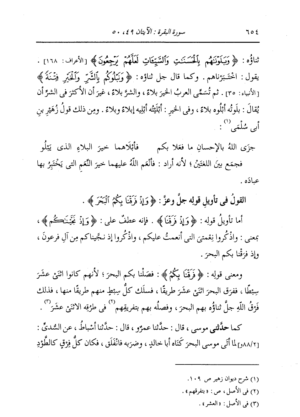 §أَمَّا تَأْوِيلُ قَوْلِهِ: {وَإِذْ فَرَقْنَا بِكُمُ} [البقرة: 50] فَإِنَّهُ عَطْفٌ عَلَى: {وَإِذْ نَجَّيْنَاكُمْ} [البقرة: 49] بِمَعْنَى: وَاذْكُرُوا نِعْمَتِيَ الَّتِي أَنْعَمْتُ عَلَيْكُمْ، وَاذْكُرُوا إِذْ نَجَّيْنَاكُمْ مِنْ آلِ فِرْعَوْنَ، وَإِذْ فَرَقْنَا بِكُمُ الْبَحْرَ. وَمَعْنَى قَوْلِهِ: {فَرَقْنَا بِكُمُ} [البقرة: 50] فَصَلْنَا بِكُمُ الْبَحْرَ، لِأَنَّهُمْ كَانُوا اثْنَيْ عَشَرَ سِبْطًا، فَفَرَقَ الْبَحْرَ اثْنَيْ عَشَرَ طَرِيقًا، فَسَلَكَ كُلُّ سِبْطٍ مِنْهُمْ طَرِيقًا مِنْهَا. فَذَلِكَ فَرْقُ اللَّهِ بِهِمْ جَلَّ ثَنَاؤُهُ الْبَحْرَ، وَفَصْلُهُ بِهِمْ بِتَفْرِيقِهِمْ فِي طَرِيقِ الِاثْنَيْ عَشَرَ
