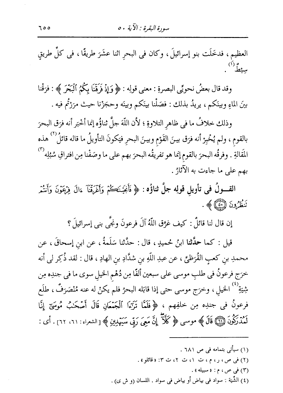 قِيلَ لَهُ كَمَا حَدَّثَنَا ابْنُ حُمَيْدٍ، قَالَ: حَدَّثَنَا سَلَمَةُ، عَنِ ابْنِ إِسْحَاقَ، عَنْ مُحَمَّدِ بْنِ كَعْبٍ الْقُرَظِيِّ، عَنْ عَبْدِ اللَّهِ بْنِ شَدَّادِ بْنِ الْهَادِ، قَالَ: " لَقَدْ ذُكِرَ لِي أَنَّهُ خَرَجَ فِرْعَوْنُ فِي طَلَبِ مُوسَى عَلَى سَبْعِينَ أَلْفًا مِنْ دُهْمِ الْخَيْلِ سِوَى مَا فِي جُنْدِهِ مِنْ شُهْبِ الْخَيْلِ؛ §وَخَرَجَ مُوسَى، حَتَّى إِذَا قَابَلَهُ الْبَحْرُ وَلَمْ يَكُنْ لَهُ عَنْهُ مُنْصَرَفٌ، طَلَعَ فِرْعَوْنُ فِي جُنْدِهِ مِنْ خَلْفِهِمْ {فَلَمَّا تَرَاءَى الْجَمْعَانِ قَالَ أَصْحَابُ مُوسَى إِنَّا لَمُدْرَكُونَ قَالَ} [الشعراء: 62] مُوسَى: {كَلَّا إِنَّ مَعِيَ رَبِّي سَيَهْدِينَ} [الشعراء: 62] أَيْ -[656]- لِلنَّجَاةِ، وَقَدْ وَعَدَنِي ذَلِكَ وَلَا خُلْفَ لِوَعْدِهِ "