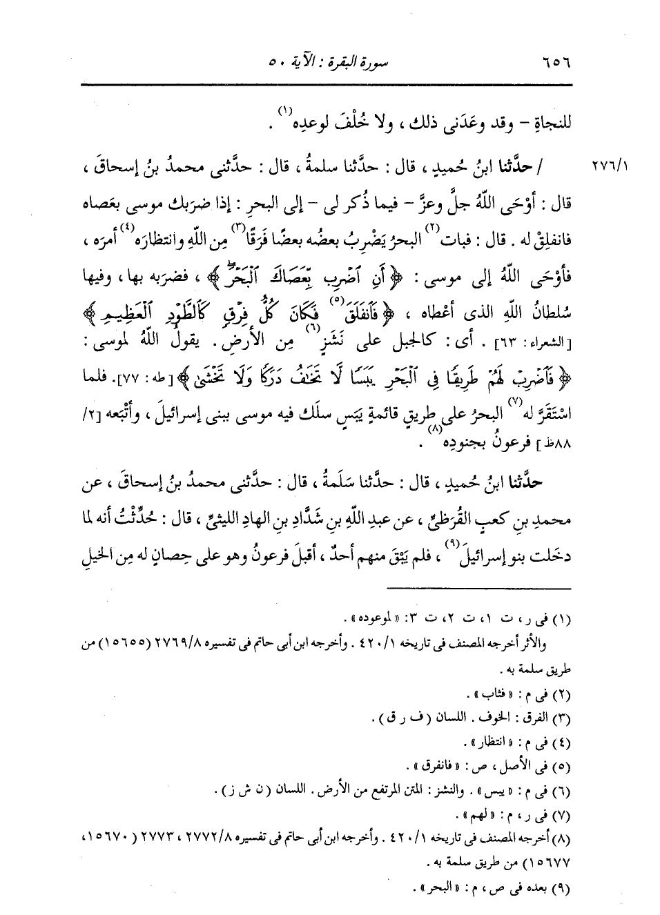 حَدَّثَنَا ابْنُ حُمَيْدٍ، قَالَ: حَدَّثَنَا سَلَمَةُ، قَالَ: حَدَّثَنِي ابْنُ إِسْحَاقَ، قَالَ: " §أَوْحَى اللَّهُ إِلَى الْبَحْرِ فِيمَا ذُكِرَ إِذَا ضَرَبَكَ مُوسَى بِعَصَاهُ فَانْفَلِقْ لَهُ، قَالَ: فَبَاتَ الْبَحْرُ يَضْرِبُ بَعْضُهُ بَعْضًا فَرَقًا مِنَ اللَّهِ وَانْتِظَارَ أَمْرِهِ، فَأَوْحَى اللَّهُ جَلَّ وَعَزَّ إِلَى مُوسَى: {أَنِ اضْرِبْ بِعَصَاكَ الْبَحْرَ} [الشعراء: 63] فَضَرَبَهُ بِهَا وَفِيهَا سُلْطَانُ اللَّهِ الَّذِي أَعْطَاهُ، {فَانْفَلَقَ فَكَانَ كُلُّ فِرْقٍ كَالطَّوْدِ الْعَظِيمِ} [الشعراء: 63] أَيْ كَالْجَبَلِ عَلَى يَبَسٍ مِنَ الْأَرْضِ. يَقُولُ اللَّهُ لِمُوسَى: {فَاضْرِبْ لَهُمْ طَرِيقًا فِي الْبَحْرِ يَبَسًا لَا تَخَافُ دَرَكًا وَلَا تَخْشَى} [طه: 77] فَلَمَّا اسْتَقَرَّ لَهُ الْبَحْرُ عَلَى طَرِيقٍ قَائِمَةٍ يَبَسٍ سَلَكَ فِيهِ مُوسَى بِبَنِي إِسْرَائِيلَ، وَأَتْبَعَهُ فِرْعَوْنُ بِجُنُودِهِ "