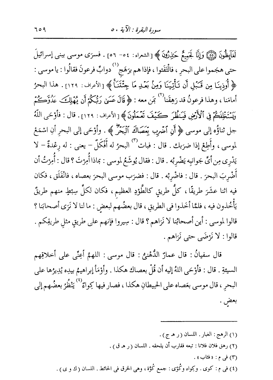 لَغَائِظُونَ وَإِنَّا لَجَمِيعٌ حَاذِرُونَ} [الشعراء: 55] فَسَرَى مُوسَى بِبَنِي إِسْرَائِيلَ حَتَّى هَجَمُوا عَلَى الْبَحْرِ، فَالْتَفَتُوا فَإِذَا هُمْ بِرَهْجِ دَوَابِّ فِرْعَوْنَ فَقَالُوا: يَا مُوسَى {أُوذِينَا مِنْ قَبْلِ أَنْ تَأْتِيَنَا وَمِنْ بَعْدِ مَا جِئْتَنَا} [الأعراف: 129] هَذَا الْبَحْرُ أَمَامَنَا، وَهَذَا فِرْعَوْنُ قَدْ رَهَقَنَا بِمَنْ مَعَهُ {قَالَ عَسَى رَبُّكُمْ أَنْ يُهْلِكَ عَدُوَّكُمْ وَيَسْتَخْلِفَكُمْ فِي الْأَرْضِ فَيَنْظُرَ كَيْفَ تَعْمَلُونَ} [الأعراف: 129] قَالَ: فَأَوْحَى اللَّهُ جَلَّ ثَنَاؤُهُ إِلَى مُوسَى {أَنِ اضْرِبْ بِعَصَاكَ الْبَحْرَ} [الشعراء: 63] وَأَوْحَى إِلَى الْبَحْرِ: أَنِ اسْمَعْ لِمُوسَى وَأَطِعْ إِذَا ضَرَبَكَ. قَالَ: فَبَاتَ الْبَحْرُ لَهُ أَفْكَلٌ، يَعْنِي لَهُ رِعْدَةٌ، لَا يَدْرِي مِنْ أَيِّ جَوَانِبِهِ يَضْرِبُهُ، قَالَ: فَقَالَ يُوشَعُ لِمُوسَى: بِمَاذَا أُمِرْتَ؟ قَالَ: أُمِرْتُ أَنْ أَضْرِبَ الْبَحْرَ. قَالَ: فَاضْرِبْهُ. قَالَ: فَضَرَبَ مُوسَى الْبَحْرَ بِعَصَاهُ، فَانْفَلَقَ، فَكَانَ فِيهِ اثْنَا عَشَرَ طَرِيقًا، كُلُّ طَرِيقٍ كَالطَّوْدِ الْعَظِيمِ، فَكَانَ لِكُلِّ سِبْطٍ مِنْهُمْ طَرِيقٌ يَأْخُذُونَ فِيهِ. فَلَمَّا أَخَذُوا فِي الطَّرِيقِ، قَالَ بَعْضُهُمْ لِبَعْضٍ: مَا لَنَا لَا نَرَى أَصْحَابَنَا؟ قَالُوا لِمُوسَى: أَيْنَ أَصْحَابُنَا لَا نَرَاهُمُ؟ قَالَ: سِيرُوا فَإِنَّهُمْ عَلَى طَرِيقٍ مِثْلِ طَرِيقِكُمْ. قَالُوا: لَا نَرْضَى حَتَّى نَرَاهُمْ، قَالَ سُفْيَانُ، قَالَ عَمَّارٌ الدُّهْنِيُّ: قَالَ مُوسَى: اللَّهُمَّ أَعِنِّي عَلَى أَخْلَاقِهِمُ السَّيِّئَةِ. قَالَ: فَأَوْحَى اللَّهُ إِلَيْهِ: أَنْ قُلْ بِعَصَاكَ هَكَذَا وَأَوْمَأَ إِبْرَاهِيمُ بِيَدِهِ يُدِيرُهَا عَلَى الْبَحْرِ قَالَ مُوسَى بِعَصَاهُ عَلَى الْحِيطَانِ هَكَذَا، فَصَارَ فِيهَا كُوًى يَنْظُرُ بَعْضُهُمْ إِلَى بَعْضٍ،