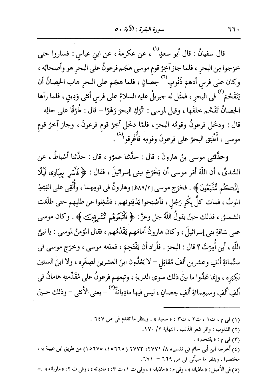 حَدَّثَنَا مُوسَى بْنُ هَارُونَ، قَالَ: حَدَّثَنَا عَمْرُو بْنُ حَمَّادٍ، قَالَ: حَدَّثَنَا أَسْبَاطُ بْنُ نَصْرٍ، عَنِ السُّدِّيِّ: " أَنَّ اللَّهَ §أَمَرَ مُوسَى أَنْ يَخْرُجَ بِبَنِي إِسْرَائِيلَ، فَقَالَ: {أَنْ أَسْرِ بِعِبَادِي لَيْلًا إِنَّكُمْ مُتَّبَعُونَ} فَخَرَجَ مُوسَى وَهَارُونُ فِي قَوْمِهِمَا، وَأُلْقِيَ عَلَى الْقِبْطِ الْمَوْتُ فَمَاتَ كُلُّ بِكْرٍ رَجُلٍ. فَأَصْبَحُوا يَدْفِنُونَهُمْ، فَشُغِلُوا عَنْ طَلَبِهِمْ حَتَّى طَلَعَتِ الشَّمْسُ، فَذَلِكَ حِينَ يَقُولُ اللَّهُ جَلَّ ثَنَاؤُهُ: {فَأَتْبَعُوهُمْ مُشْرِقِينَ} [الشعراء: 60] فَكَانَ مُوسَى عَلَى سَاقَةِ بَنِي إِسْرَائِيلَ، وَكَانَ هَارُونُ أَمَامَهُمْ يَقْدُمُهُمْ. فَقَالَ الْمُؤْمِنُ لِمُوسَى: يَا نَبِيَّ اللَّهِ، أَيْنَ أُمِرْتَ؟ قَالَ: الْبَحْرَ. فَأَرَادَ أَنْ يَقْتَحِمَ، فَمَنَعَهُ مُوسَى. وَخَرَجَ مُوسَى فِي سِتِّمِائَةِ أَلْفٍ وَعِشْرِينَ أَلْفَ مُقَاتِلٍ، لَا يَعُدُّونَ ابْنَ الْعِشْرِينَ لِصِغَرِهِ وَلَا ابْنَ السِّتِّينَ لِكِبَرِهِ، وَإِنَّمَا عَدُّوا مَا بَيْنَ ذَلِكَ سِوَى الذُّرِّيَّةِ. وَتَبِعَهُمْ فِرْعَوْنُ وَعَلَى مَقْدِمَتِهِ هَامَانُ فِي أَلْفِ أَلْفٍ وَسَبْعِمِائَةِ أَلْفِ حِصَانٍ لَيْسَ فِيهَا مَاذْبَانَهْ، يَعْنِي الْأُنْثَى؛ وَذَلِكَ حِينَ -[661]- يَقُولُ اللَّهُ جَلَّ ثَنَاؤُهُ: {فَأَرْسَلَ فِرْعَوْنُ فِي الْمَدَائِنِ حَاشِرِينَ إِنَّ هَؤُلَاءِ لَشِرْذِمَةٌ قَلِيلُونَ} [الشعراء: 54] يَعْنِي بَنِي إِسْرَائِيلَ. فَتَقَدَّمَ هَارُونُ، فَضَرَبَ الْبَحْرَ، فَأَبَى الْبَحْرُ أَنْ يَنْفَتِحَ، وَقَالَ: مَنْ هَذَا الْجَبَّارُ الَّذِي يَضْرِبُنِي؟ حَتَّى أَتَاهُ مُوسَى، فَكَنَّاهُ أَبَا خَالِدٍ وَضَرَبَهُ فَانْفَلَقَ {فَكَانَ كُلُّ فِرْقٍ كَالطَّوْدِ الْعَظِيمِ} [الشعراء: 63] يَقُولُ: كَالْجَبَلِ الْعَظِيمِ. فَدَخَلَتْ بَنُو إِسْرَائِيلَ. وَكَانَ فِي الْبَحْرِ اثْنَا عَشَرَ طَرِيقًا، فِي كُلِّ طَرِيقٍ سِبْطٌ، وَكَانَتِ الطُّرُقُ انْفَلَقَتْ بِجُدْرَانٍ، فَقَالَ كُلُّ سِبْطٍ: قَدْ قُتِلَ أَصْحَابُنَا. فَلَمَّا رَأَى ذَلِكَ مُوسَى، دَعَا اللَّهَ، فَجَعَلَهَا لَهُمْ قَنَاطِرَ كَهَيْئَةِ الطِّيقَانِ. فَنَظَرَ آخِرُهُمْ إِلَى أَوَّلِهِمْ، حَتَّى خَرَجُوا جَمِيعًا. ثُمَّ دَنَا فِرْعَوْنُ وَأَصْحَابُهُ، فَلَمَّا نَظَرَ فِرْعَوْنُ إِلَى الْبَحْرِ مُنْفَلِقًا، قَالَ: أَلَا تَرَوْنَ الْبَحْرَ فُرِقَ مِنِّي قَدِ انْفَتَحَ لِي حَتَّى أُدْرِكَ أَعْدَائِي فَأَقْتُلَهُمْ؟ فَذَلِكَ حِينَ يَقُولُ اللَّهُ جَلَّ ثَنَاؤُهُ: {وَأَزْلَفْنَا ثَمَّ الْآخِرِينَ} [الشعراء: 64] يَقُولُ: قَرَّبْنَا ثَمَّ الْآخِرِينَ؛ يَعْنِي آلَ فِرْعَوْنَ. فَلَمَّا قَامَ فِرْعَوْنُ عَلَى أَفْوَاهِ الطُّرُقِ أَبَتْ خَيْلُهُ أَنْ تَقْتَحِمَ، فَنَزَلَ جِبْرِيلُ عَلَى مَاذْبَانِهِ، فَشَامَّ الْحِصَانُ رِيحَ الْمَاذْبَانَهْ، فَاقْتَحَمَ فِي أَثَرِهَا، حَتَّى إِذَا هَمَّ أَوَّلُهُمْ أَنْ يَخْرُجَ وَدَخَلَ آخِرُهُمْ، أَمَرَ الْبَحْرَ أَنْ يَأْخُذَهُمْ، فَالْتَطَمَ عَلَيْهِمْ "