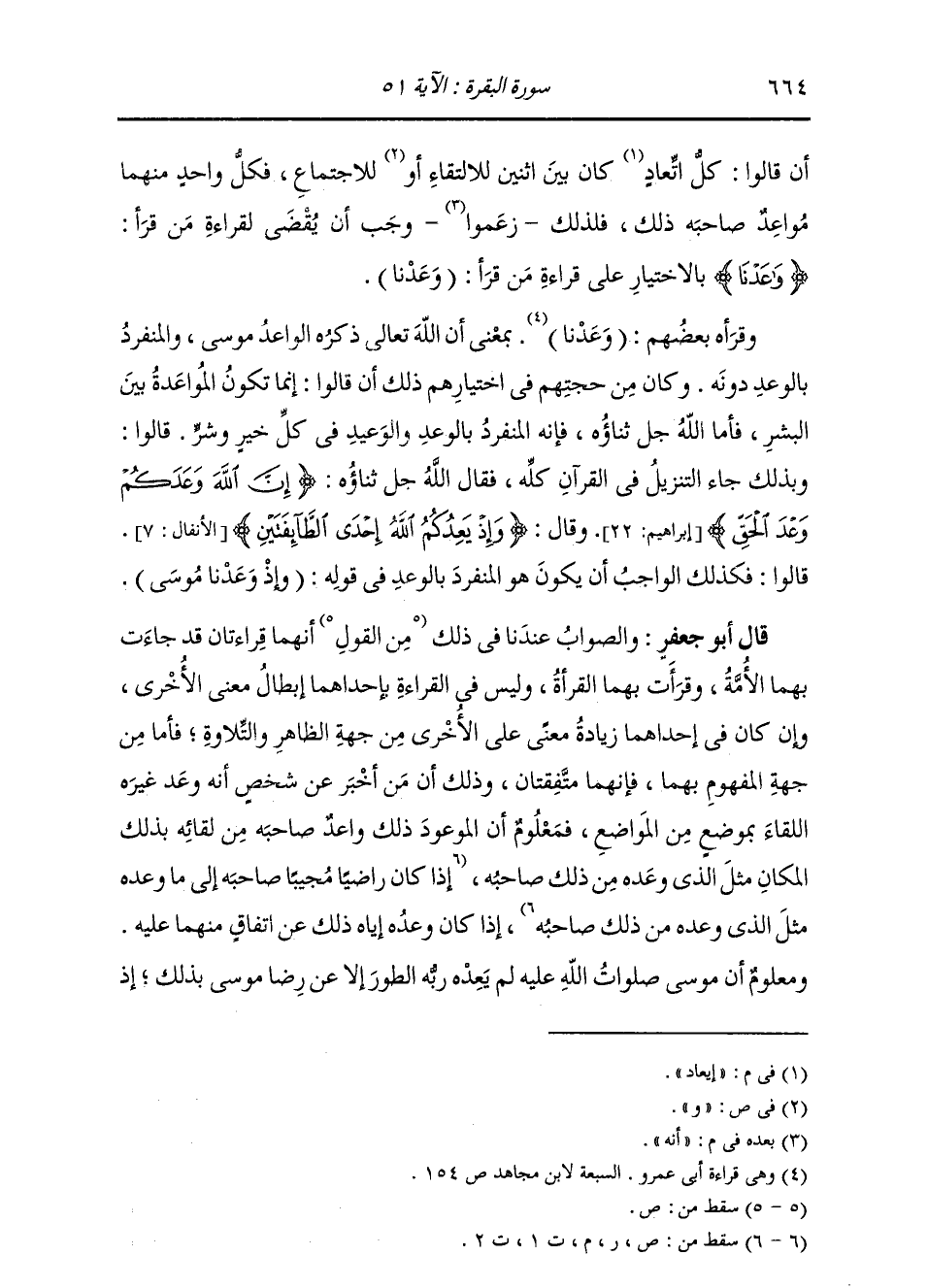 أَنْ قَالُوا: كُلُّ إِيعَادٍ كَانَ بَيْنَ اثْنَيْنِ لِلِالْتِقَاءِ أَوِ الِاجْتِمَاعِ، فَكُلُّ وَاحِدٍ مِنْهُمَا مُوَاعِدٌ صَاحِبَهُ ذَلِكَ، فَلِذَلِكَ زَعَمُوا أَنَّهُ وَجَبَ أَنْ يَقْضِيَ لِقِرَاءَةِ مَنْ قَرَأَ: {وَاعَدْنَا} [البقرة: 51] بِالِاخْتِيَارِ عَلَى قِرَاءَةِ مَنْ قَرَأَ (وَاعَدَنَا) . وَقَرَأَ بَعْضُهُمْ: (وَعَدْنَا) بِمَعْنَى أَنَّ اللَّهَ الْوَاعِدُ مُوسَى، وَالْمُنْفَرِدُ بِالْوَعْدِ دُونَهُ. وَكَانَ مِنْ حُجَّتِهِمْ فِي اخْتِيَارِهِمْ ذَلِكَ، أَنْ قَالُوا: إِنَّمَا تَكُونُ الْمُوَاعَدَةُ بَيْنَ الْبَشَرِ، فَأَمَّا اللَّهُ جَلَّ ثَنَاؤُهُ فَإِنَّهُ الْمُنْفَرِدُ بِالْوَعْدِ وَالْوَعِيدِ فِي كُلِّ خَيْرٍ وَشَرٍّ. قَالُوا: وَبِذَلِكَ جَاءَ التَّنْزِيلِ فِي الْقُرْآنِ كُلِّهِ، فَقَالَ جَلَّ ثَنَاؤُهُ: {إِنَّ اللَّهَ وَعَدَكُمْ وَعْدَ الْحَقِّ} [إبراهيم: 22] وَقَالَ: {وَإِذْ يَعِدُكُمُ اللَّهُ إِحْدَى الطَّائِفَتَيْنِ أَنَّهَا لَكُمْ} [الأنفال: 7] قَالُوا: فَكَذَلِكَ الْوَاجِبُ أَنْ يَكُونَ هُوَ الْمُنْفَرِدُ بِالْوَعْدِ فِي قَوْلِهِ: (وَإِذْ وَعَدْنَا مُوسَى) . وَالصَّوَابُ عِنْدَنَا فِي ذَلِكَ مِنَ الْقَوْلِ، أَنَّهُمَا قِرَاءَتَانِ قَدْ جَاءَتْ بِهِمَا الْأُمَّةُ وَقَرَأَتْ بِهِمَا الْقُرَّاءُ، وَلَيْسَ فِي الْقِرَاءَةِ بِإِحْدَاهُمَا إِبْطَالُ مَعْنَى الْأُخْرَى، وَإِنْ كَانَ فِي إِحْدَاهُمَا زِيَادَةُ مَعْنَى عَلَى الْأُخْرَى مِنْ جِهَةِ الظَّاهِرِ وَالتِّلَاوَةِ. فَأَمَّا مِنْ جِهَةِ الْمَفْهُومِ بِهِمَا فَهُمَا مُتَّفِقَتَانِ، وَذَلِكَ أَنَّ مَنْ أَخْبَرَ عَنْ شَخْصٍ أَنَّهُ وَعَدَ غَيْرَهُ اللِّقَاءَ بِمَوْضِعٍ مِنَ الْمَوَاضِعِ، فَمَعْلُومٌ أَنَّ الْمَوْعُودَ ذَلِكَ وَاعَدَ صَاحِبَهُ مِنْ لِقَائِهِ بِذَلِكَ الْمَكَانِ، مِثْلُ الَّذِي وَعَدَهُ مِنْ ذَلِكَ صَاحِبُهُ إِذَا كَانَ وَعَدَهُ مَا وَعَدَهُ إِيَّاهُ مِنْ ذَلِكَ عَنِ اتِّفَاقٍ مِنْهُمَا عَلَيْهِ. وَمَعْلُومٌ أَنَّ مُوسَى صَلَوَاتُ اللَّهِ عَلَيْهِ لَمْ يَعِدْهُ رَبُّهُ الطُّورَ إِلَّا عَنْ رِضَا مُوسَى بِذَلِكَ، إِذْ