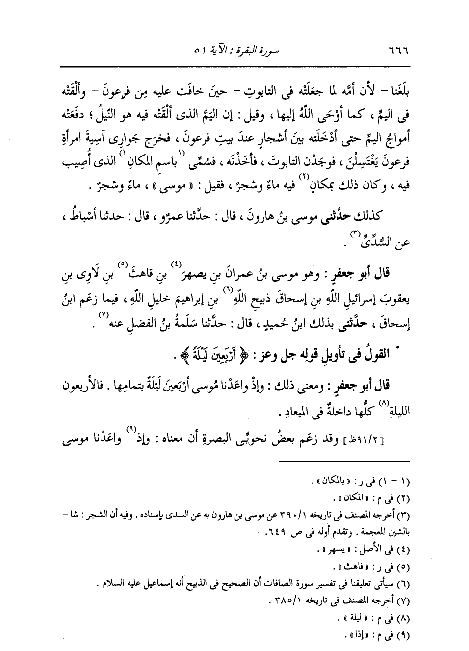 §الْقَوْلُ فِي تَأْوِيلِ قَوْلِهِ تَعَالَى: {أَرْبَعِينَ لَيْلَةً} [البقرة: 51] وَمَعْنَى ذَلِكَ {وَإِذْ وَاعَدْنَا مُوسَى أَرْبَعِينَ لَيْلَةً} [البقرة: 51] بِتَمَامِهَا، فَالْأَرْبَعُونَ لَيْلَةً كُلُّهَا دَاخِلَةٌ فِي الْمِيعَادِ. وَقَدْ زَعَمَ بَعْضُ نَحْوِيِّي الْبَصْرَةِ أَنَّ مَعْنَاهُ: وَإِذْ وَاعَدْنَا مُوسَى -[667]- انْقِضَاءَ أَرْبَعِينَ لَيْلَةً أَيْ رَأْسُ الْأَرْبَعِينِ، وَمَثَّلَ ذَلِكَ بِقَوْلِهِ: {وَاسْأَلِ الْقَرْيَةَ} [يوسف: 82] وَبِقَوْلِهِمُ الْيَوْمَ أَرْبَعُونَ مُنْذُ خَرَجَ فُلَانٌ، وَالْيَوْمَ يَوْمَانِ، أَيِ الْيَوْمَ تَمَامُ يَوْمَيْنِ وَتَمَامُ أَرْبَعِينَ. وَذَلِكَ خِلَافُ مَا جَاءَتْ بِهِ الرِّوَايَةُ عَنْ أَهْلِ التَّأْوِيلِ وَخِلَافُ ظَاهِرِ التِّلَاوَةِ، فَأَمَّا ظَاهِرُ التِّلَاوَةِ، فَإِنَّ اللَّهَ جَلَّ ثَنَاؤُهُ قَدْ أَخْبَرَ أَنَّهُ وَاعَدَ مُوسَى أَرْبَعِينَ لَيْلَةً، فَلَيْسَ لِأَحَدٍ إِحَالَةُ ظَاهِرِ خَبَرِهِ إِلَى بَاطِنٍ بِغَيْرِ بُرْهَانٍ دَالٍّ عَلَى صِحَّتِهِ. وَأَمَّا أَهْلُ التَّأْوِيلِ فَإِنَّهُمْ قَالُوا فِي ذَلِكَ مَا أَنَا ذَاكِرُهُ