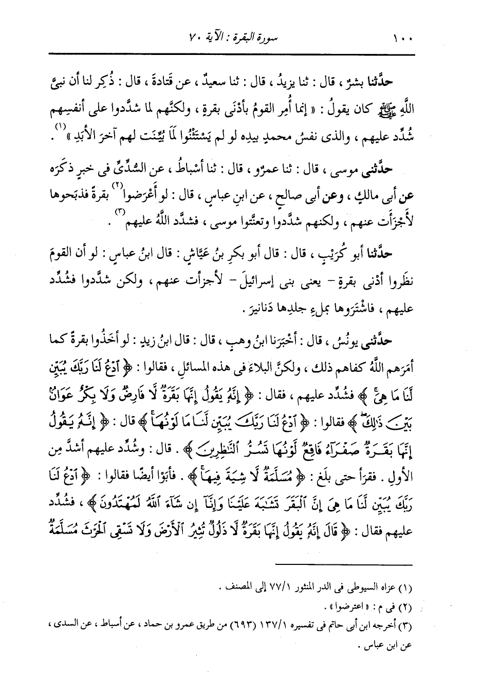 حَدَّثَنَا بِشْرٌ، قَالَ: ثنا يَزِيدُ، قَالَ: ثنا سَعِيدٌ، عَنْ قَتَادَةَ، قَالَ: ذُكِرَ لَنَا أَنَّ نَبِيَّ اللَّهِ صَلَّى اللهُ عَلَيْهِ وَسَلَّمَ كَانَ يَقُولُ: «§إِنَّمَا أُمِرَ الْقَوْمُ بِأَدْنَى بَقَرَةٍ وَلَكِنَّهُمْ لَمَّا شَدَّدُوا عَلَى أَنْفُسِهِمْ شُدِّدَ عَلَيْهِمْ، وَالَّذِي نَفْسُ مُحَمَّدٍ بِيَدِهِ لَوْ لَمْ يَسْتَثْنُوا لَمَا بُيِّنَتْ لَهُمْ آخِرَ الْأَبَدِ»