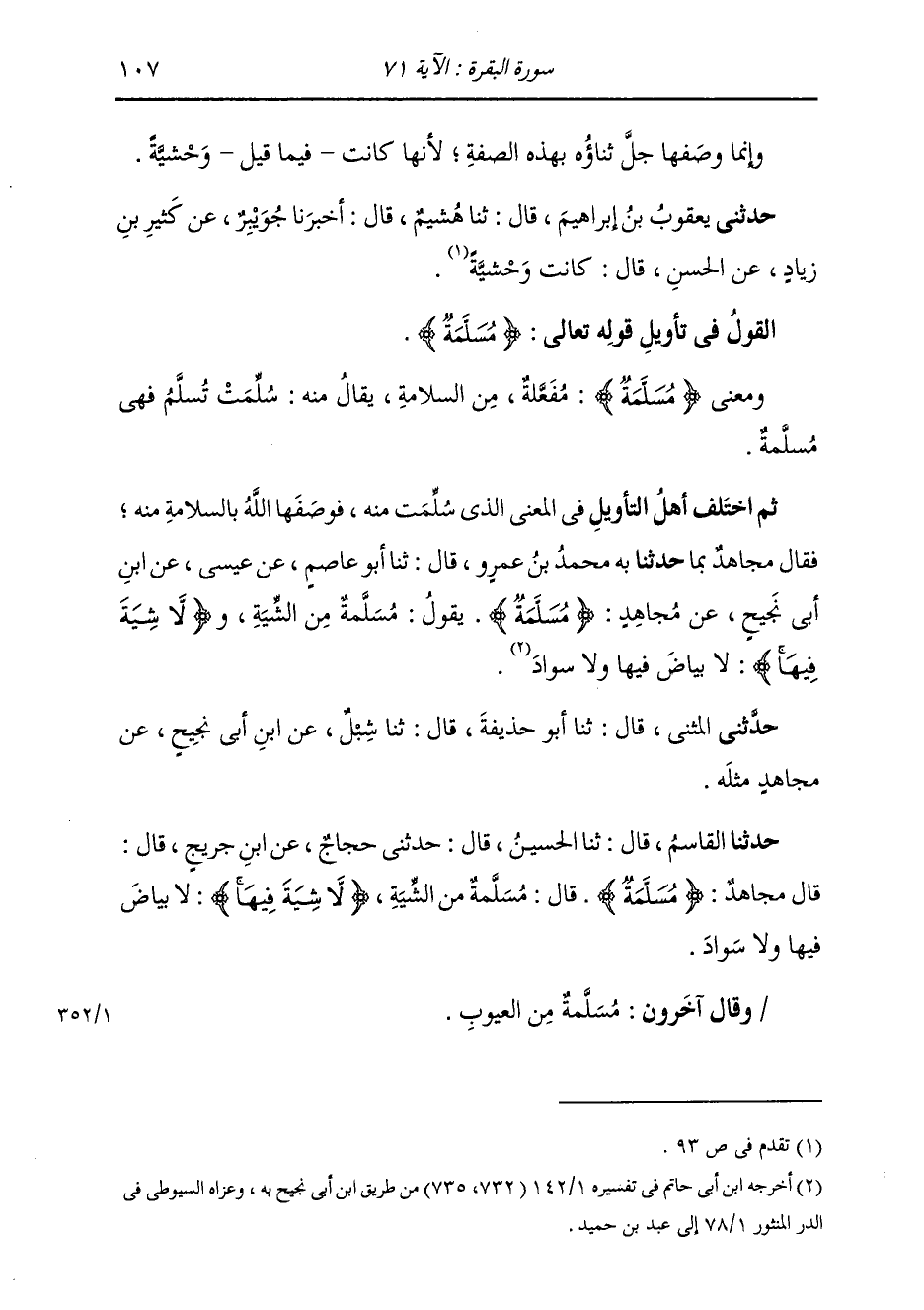 حَدَّثَنَا الْقَاسِمُ قَالَ: ثنا الْحُسَيْنُ، قَالَ: حَدَّثَنِي حَجَّاجٌ، عَنِ ابْنِ جُرَيْجٍ، قَالَ: قَالَ مُجَاهِدٌ: " {§لَا شِيَةَ فِيهَا} [البقرة: 71] قَالَ: مُسَلَّمَةٌ مِنَ الشِّيَةِ {لَا شِيَةَ فِيهَا} [البقرة: 71] لَا بَيَاضَ فِيهَا وَلَا سَوَادَ " وَقَالَ آخَرُونَ: مُسَلَّمَةٌ مِنَ الْعُيُوبِ