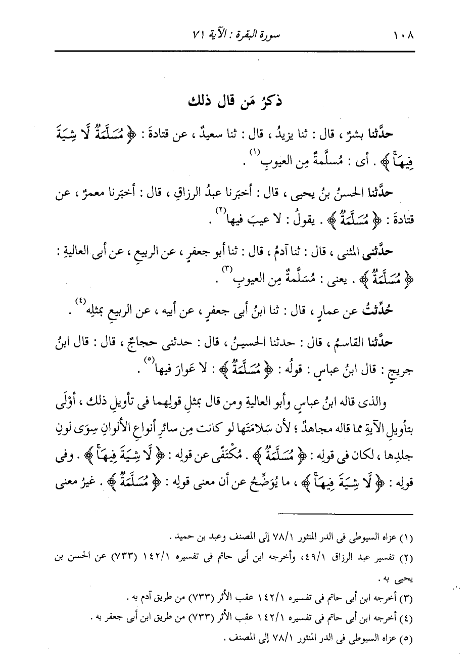 ذِكْرُ مَنْ قَالَ ذَلِكَ حَدَّثَنَا بِشْرٌ، قَالَ: ثنا يَزِيدُ، قَالَ: ثنا سَعِيدٌ، عَنْ قَتَادَةَ: " {§مُسَلَّمَةٌ لَا شِيَةَ فِيهَا} [البقرة: 71] أَيْ مُسَلَّمَةٌ مِنَ الْعُيُوبِ "