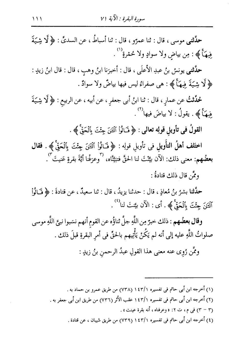 §الْقَوْلُ فِي تَأْوِيلِ قَوْلِهِ تَعَالَى: {قَالُوا الْآنَ جِئْتَ بِالْحَقِّ} [البقرة: 71] اخْتَلَفَ أَهْلُ التَّأْوِيلِ فِي تَأْوِيلِ قَوْلِهِ: {قَالُوا الْآنَ جِئْتَ بِالْحَقِّ} [البقرة: 71] فَقَالَ بَعْضُهُمْ: مَعْنَى ذَلِكَ: الْآنَ بَيَّنْتَ لَنَا الْحَقَّ فَتَبَيَّنَّاهُ، وَعَرَفْنَا أَيَّةَ بَقَرَةٍ عَيَّنْتَ. وَمِمَّنْ قَالَ ذَلِكَ قَتَادَةُ