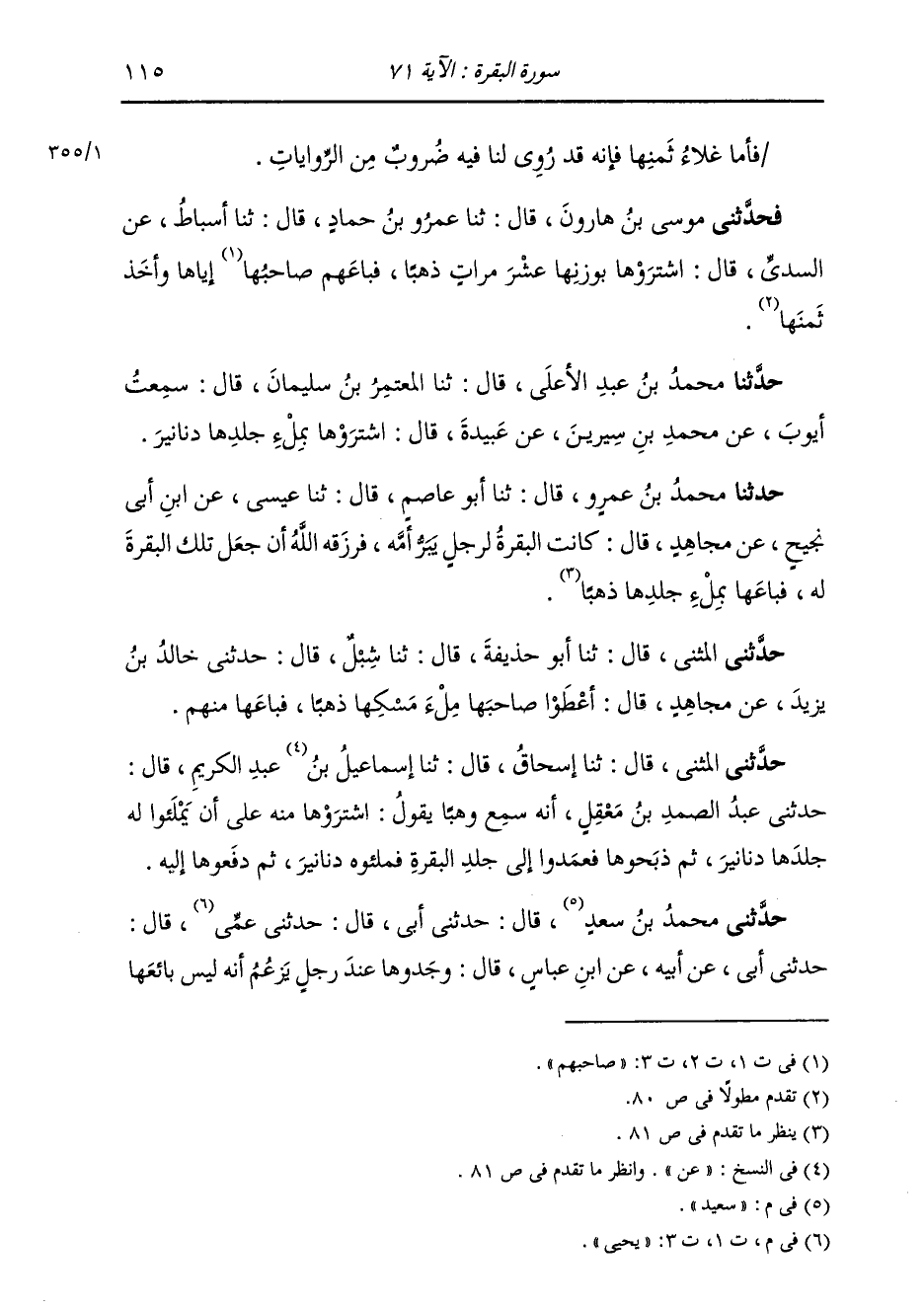 حَدَّثَنِي الْمُثَنَّى، قَالَ: ثنا إِسْحَاقُ، قَالَ: ثنا إِسْمَاعِيلُ بْنُ عَبْدِ الْكَرِيمِ قَالَ: حَدَّثَنِي عَبْدُ الصَّمَدِ بْنُ مَعْقِلٍ، أَنَّهُ سَمِعَ وَهْبًا، يَقُولُ: «§اشْتَرَوْهَا مِنْهُ عَلَى أَنْ يَمْلَئُوا لَهُ جِلْدَهَا دَنَانِيرَ، ثُمَّ ذَبَحُوهَا فَعَمَدُوا إِلَى جِلْدِ الْبَقَرَةِ فَمَلَئُوهُ دَنَانِيرَ، ثَمَنٌ دَفَعُوهَا إِلَيْهِ»