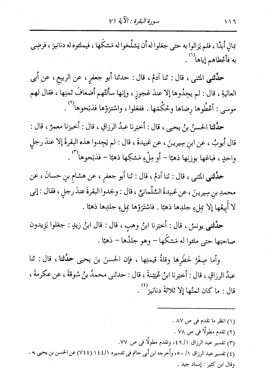 حَدَّثَنِي الْمُثَنَّى، قَالَ: ثنا آدَمُ، قَالَ: ثنا أَبُو جَعْفَرٍ، عَنْ هِشَامِ بْنِ حَسَّانَ، عَنْ مُحَمَّدِ بْنِ سِيرِينَ، عَنْ عَبِيدَةَ السَّلْمَانِيِّ، قَالَ: " وَجَدُوا الْبَقَرَةَ عِنْدَ رَجُلٍ، فَقَالَ: §إِنِّي لَا أَبِيعُهَا إِلَّا بِمِلْءِ جِلْدِهَا ذَهَبًا، فَاشْتَرُوهَا بِمِلْءِ جِلْدِهَا ذَهَبًا "