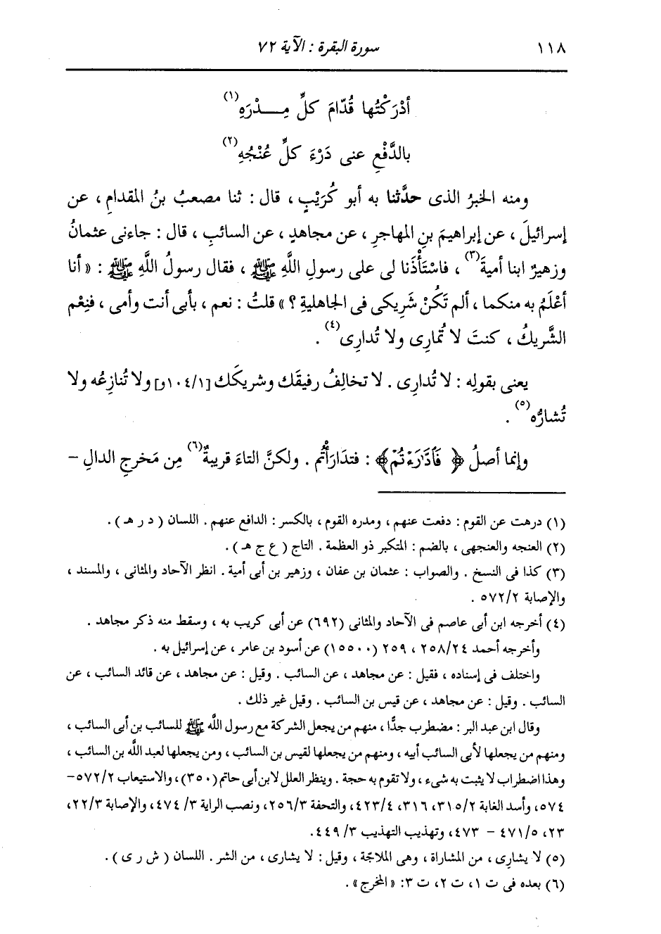 وَمِنْهُ الْخَبَرُ الَّذِي حَدَّثَنَا بِهِ أَبُو كُرَيْبٍ، قَالَ: ثنا مُصْعَبُ بْنُ الْمِقْدَامِ، عَنْ إِسْرَائِيلَ، عَنْ إِبْرَاهِيمَ بْنِ الْمُهَاجِرِ، عَنْ مُجَاهِدٍ، عَنِ السَّائِبِ، قَالَ: جَاءَنِي عُثْمَانُ وَزُهَيْرٌ ابْنَا أُمَيَّةَ، فَاسْتَأْذَنَا لِي عَلَى رَسُولِ اللَّهِ صَلَّى اللهُ عَلَيْهِ وَسَلَّمَ، فَقَالَ رَسُولُ اللَّهِ صَلَّى اللهُ عَلَيْهِ وَسَلَّمَ: «§أَنَا أَعْلَمُ بِهِ مِنْكُمَا، أَلَمْ تَكُنْ شَرِيكِي فِي الْجَاهِلِيَّةِ؟» قُلْتُ: نَعَمْ بِأَبِي أَنْتَ وَأُمِّي، فَنِعْمَ الشَّرِيكُ كُنْتَ لَا تُمَارِي وَلَا تُدَارِي " يَعْنِي بِقَوْلِهِ: لَا تُدَارِي: لَا تُخَالِفُ رَفِيقَكَ وَشَرِيكَكَ وَلَا تُنَازِعُهُ وَلَا تُشَارِهِ. وَإِنَّمَا أَصْلُ {فَادَّارَأْتُمْ} [البقرة: 72] فَتَدَارَأْتُمْ، وَلَكِنَّ التَّاءَ قَرِيبَةٌ مِنْ مَخْرَجِ الدَّالِّ، -[119]- وَذَلِكَ أَنَّ مَخْرَجَ التَّاءِ مِنْ طَرَفِ اللِّسَانِ وَأُصُولِ الشَّفَتَيْنِ، وَمَخْرَجُ الدَّالِّ مِنْ طَرَفِ اللِّسَانِ وَأَطْرَافِ الثَّنِيَّتَيْنِ، فَأُدْغِمَتِ التَّاءُ فِي الدَّالِّ فَجُعِلَتْ دَالًا مُشَدَّدَةً، كَمَا قَالَ الشَّاعِرُ: