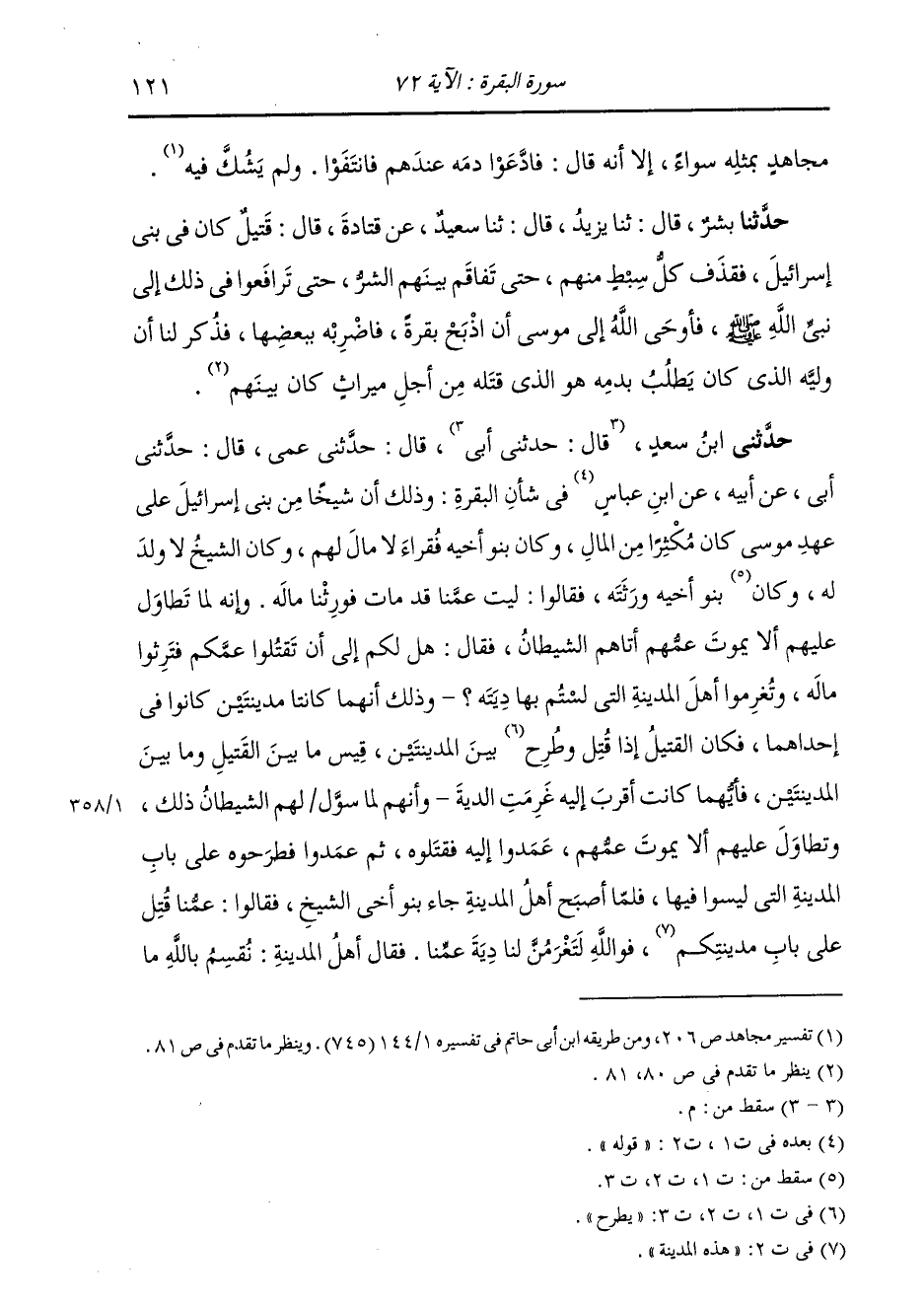 حَدَّثَنَا بِشْرٌ، قَالَ: ثنا يَزِيدُ، قَالَ: ثنا سَعِيدٌ، عَنْ قَتَادَةَ، قَالَ: «§قَتِيلٌ كَانَ فِي بَنِي إِسْرَائِيلَ فَقَذَفَ كُلُّ سِبْطٍ مِنْهُمْ حَتَّى تَفَاقَمُ بَيْنَهُمُ الشَّرُّ حَتَّى تَرَافَعُوا فِي ذَلِكَ إِلَى نَبِيِّ اللَّهِ صَلَّى اللهُ عَلَيْهِ وَسَلَّمَ، فَأَوْحَى إِلَى مُوسَى أَنِ اذْبَحْ بَقَرَةً فَاضْرِبْهُ بِبَعْضِهَا. فَذُكِرَ لَنَا أَنَّ وَلِيَّهُ الَّذِي كَانَ يَطْلُبُ بِدَمِهِ هُوَ الَّذِي قَتَلَهُ مِنْ أَجْلِ مِيرَاثٍ كَانَ بَيْنَهُمْ»