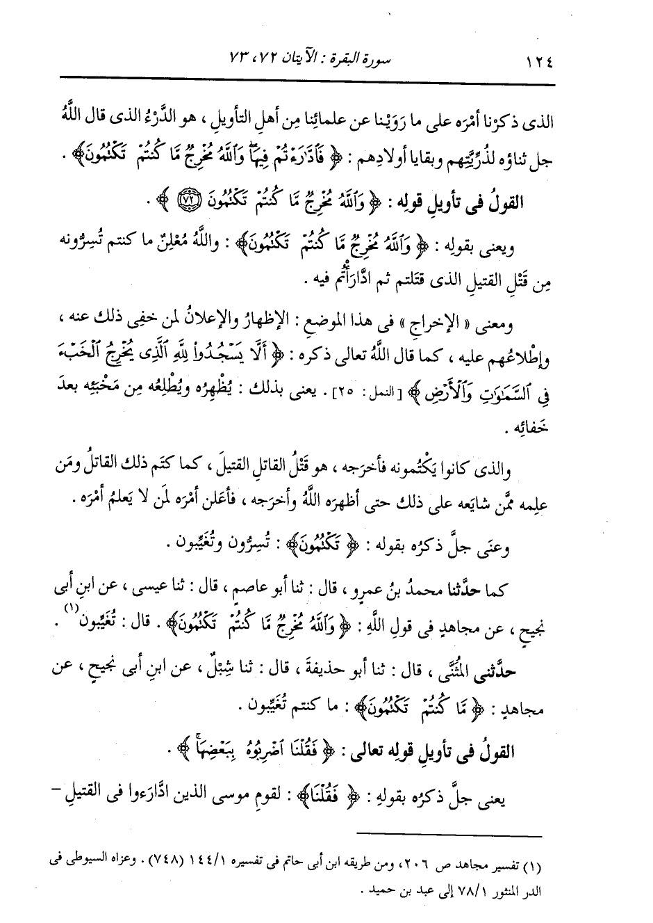 §الْقَوْلُ فِي تَأْوِيلِ قَوْلِهِ تَعَالَى: {وَاللَّهُ مُخْرِجٌ مَا كُنْتُمْ تَكْتُمُونَ} [البقرة: 72] وَيَعْنِي بِقَوْلِهِ: {وَاللَّهُ مُخْرِجٌ مَا كُنْتُمْ تَكْتُمُونَ} [البقرة: 72] وَاللَّهُ مُعْلِنٌ مَا كُنْتُمْ تُسِرُّونَهُ مِنْ قَتْلِ الْقَتِيلِ الَّذِي قَتَلْتُمْ ثُمَّ ادَّارَأْتُمْ فِيهِ. وَمَعْنَى الْإِخْرَاجِ فِي هَذَا الْمَوْضِعِ: الْإِظْهَارُ وَالْإِعْلَانُ لِمَنْ خَفِيَ ذَلِكَ عَنْهُ وَإِطْلَاعُهُمْ عَلَيْهِ، كَمَا قَالَ اللَّهُ تَعَالَى ذِكْرُهُ: {أَلَّا يَسْجُدُوا لِلَّهِ الَّذِي يُخْرِجُ الْخَبْءَ فِي السَّمَوَاتِ وَالْأَرْضِ} يَعْنِي بِذَلِكَ: يُظْهِرُهُ وَيُطْلِعُهُ مِنْ مَخْبَئهِ بَعْدَ خَفَائِهِ. وَالَّذِي كَانُوا يَكْتُمُونَهُ فَإِخْرَاجُهُ هُوَ قَتْلُ الْقَاتِلِ الْقَتِيلَ، كَمَا كَتَمَ ذَلِكَ الْقَاتِلُ وَمَنْ عَلِمَهُ مِمَّنْ شَايَعَهُ عَلَى ذَلِكَ حَتَّى أَظْهَرَهُ اللَّهُ وَأَخْرَجَهُ، فَأَعْلَنَ أَمْرَهُ لِمَنْ لَا يَعْلَمُ أَمْرَهُ. وَعَنَى جَلَّ ثَنَاؤُهُ بِقَوْلِهِ: {تَكْتُمُونَ} [البقرة: 33] تُسِرُّونَ وَتَغِيبُونَ