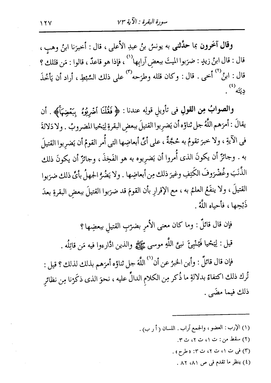 وَقَالَ آخَرُونَ بِمَا حَدَّثَنِي بِهِ، يُونُسُ بْنُ عَبْدِ الْأَعْلَى، قَالَ: أَخْبَرَنَا ابْنُ وَهْبٍ، قَالَ: قَالَ ابْنُ زَيْدٍ: " §ضَرَبُوا الْمَيِّتَ بِبَعْضِ آرَابِهَا، فَإِذَا هُوَ قَاعِدٌ، قَالُوا: مَنْ قَتَلَكَ؟ قَالَ: ابْنُ أَخِي قَالَ: وَكَانَ قَتَلَهُ وَطَرَحَهُ عَلَى ذَلِكَ السِّبْطِ، أَرَادَ أَنْ يَأْخُذَ دِيَتَهُ " وَالصَّوَابُ مِنَ الْقَوْلِ فِي تَأْوِيلِ قَوْلِهِ عِنْدَنَا: {فَقُلْنَا اضْرِبُوهُ بِبَعْضِهَا} [البقرة: 73] أَنْ يُقَالَ: أَمَرَهُمُ اللَّهُ جَلَّ ثَنَاؤُهُ أَنْ يَضْرِبُوا الْقَتِيلَ بِبَعْضِ الْبَقَرَةِ لِيَحْيَا الْمَضْرُوبُ. وَلَا دَلَالَةَ فِي الْآيَةِ وَلَا خَبَرَ تَقُومُ بِهِ حُجَّةٌ عَلَى أَيِّ أَبْعَاضِهَا الَّتِي أُمِرَ الْقَوْمُ أَنْ يَضْرِبُوا الْقَتِيلَ بِهِ. وَجَائِزٌ أَنْ يَكُونَ الَّذِي أُمِرُوا أَنْ يَضْرِبُوهُ بِهِ هُوَ الْفَخِذُ، وَجَائِزٌ أَنْ يَكُونَ ذَلِكَ الذَّنَبَ وَغُضْرُوفَ الْكَتِفِ وَغَيْرَ ذَلِكَ مِنْ أَبْعَاضِهَا. وَلَا يَضُرُّ الْجَهْلُ بِأَيِّ ذَلِكَ ضَرَبُوا الْقَتِيلَ، وَلَا يَنْفَعُ الْعِلْمُ بِهِ مَعَ الْإِقْرَارِ بِأَنَّ الْقَوْمَ قَدْ ضَرَبُوا الْقَتِيلَ بِبَعْضِ الْبَقَرَةِ بَعْدَ ذَبْحِهَا، فَأَحْيَاهُ اللَّهُ. فَإِنْ قَالَ قَائِلٌ: وَمَا كَانَ مَعْنَى الْأَمْرِ بِضَرْبِ الْقَتِيلِ بِبَعْضِهَا؟ قِيلَ: لِيَحْيَا فَيُنْبِئُ نَبِيَّ اللَّهِ مُوسَى صَلَّى اللهُ عَلَيْهِ وَسَلَّمَ وَالَّذِينَ ادَّارَءُوا فِيهِ مِنْ قَاتِلِهِ. فَإِنْ قَالَ قَائِلٌ: وَأَيْنَ الْخَبَرُ عَنْ أَنَّ اللَّهَ جَلَّ ثَنَاؤُهُ أَمَرَهُمْ بِذَلِكَ لِذَلِكَ؟ قِيلَ: تَرَكَ ذَلِكَ اكْتِفَاءً بِدَلَالَةِ مَا ذَكَرَ مِنَ الْكَلَامِ الدَّالِّ عَلَيْهِ نَحْوَ الَّذِي ذَكَرْنَا مِنْ نَظَائِرِ ذَلِكَ فِيمَا مَضَى.