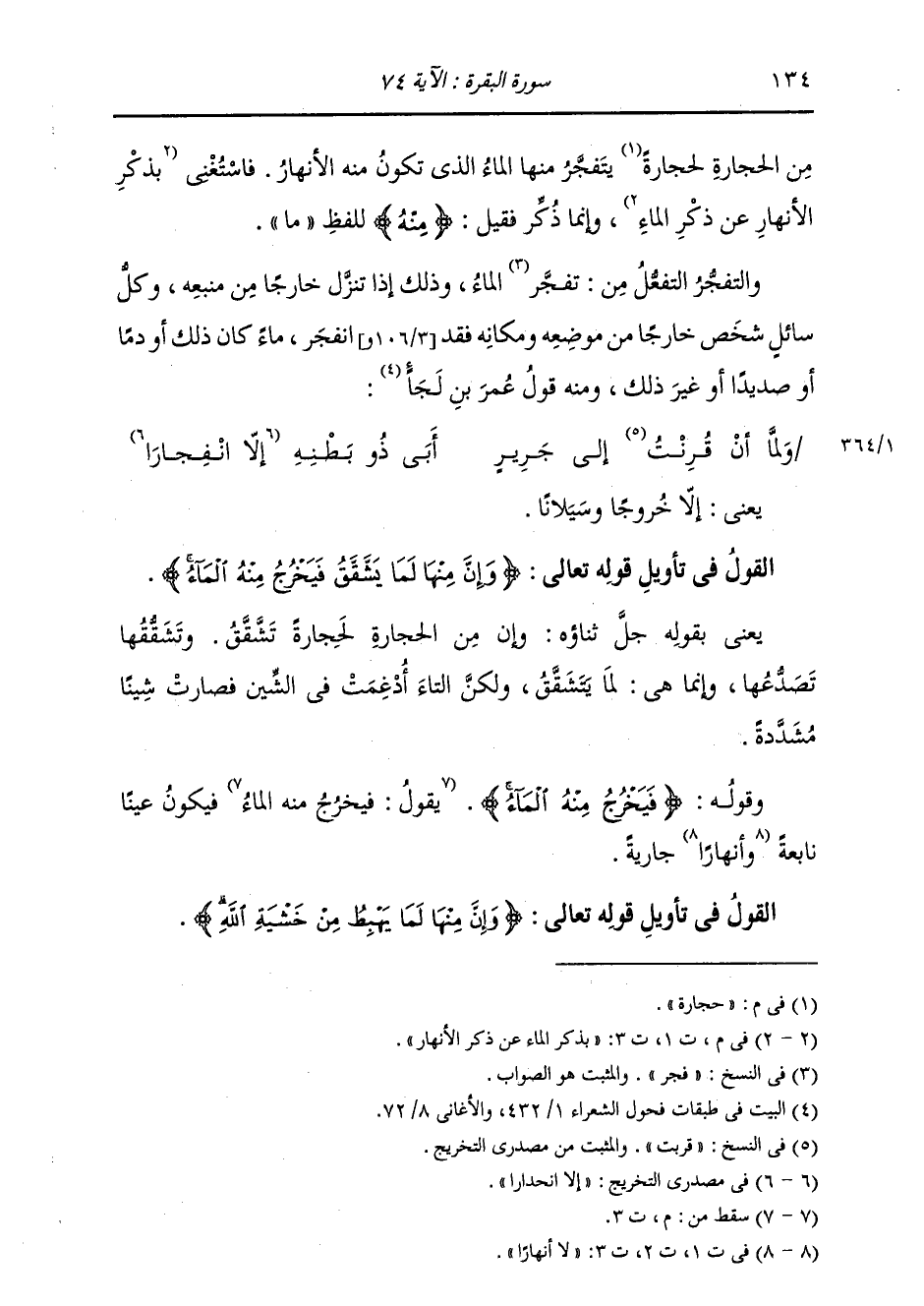 §الْقَوْلُ فِي تَأْوِيلِ قَوْلِهِ تَعَالَى: {وَإِنَّ مِنْهَا لَمَّا يَشَّقَّقُ فَيَخْرُجُ مِنْهُ الْمَاءُ} [البقرة: 74] يَعْنِي بِقَوْلِهِ جَلَّ ثَنَاؤُهُ وَإِنَّ مِنَ الْحِجَارَةِ لَحِجَارَةً تَشَقَّقُ. وَتَشَقُّقُهَا: تَصَدُّعُهَا. وَإِنَّمَا هِيَ: لِمَا يَتَشَقَّقُ، وَلَكِنَّ التَّاءَ أُدْغِمَتْ فِي الشِّينِ فَصَارَتْ شِينًا مُشَدَّدَةً. وَقَوْلُهُ: {فَيَخْرُجُ مِنْهُ الْمَاءُ} [البقرة: 74] فَيَكُونُ عَيْنًا نَابِعَةً وَأَنْهَارًا جَارِيَةً