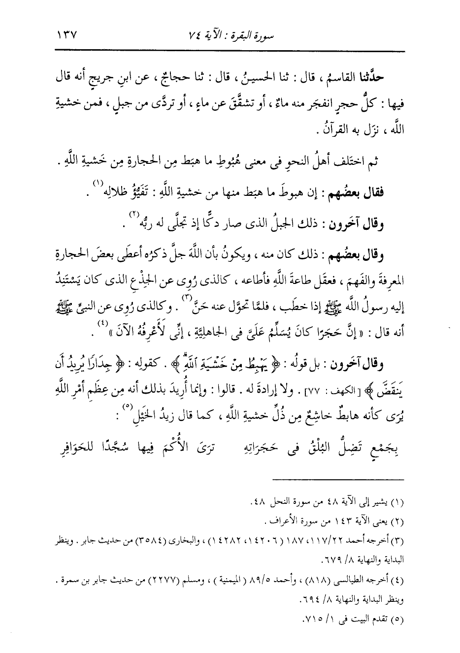 حَدَّثَنَا الْقَاسِمُ، قَالَ: ثنا الْحُسَيْنُ، قَالَ: ثنا حَجَّاجٌ، عَنِ ابْنِ جُرَيْجٍ، أَنَّهُ قَالَ: «§فِيهَا كُلُّ حَجَرٍ انْفَجَرَ مِنْهُ مَاءٌ أَوْ تَشَقَّقَ عَنْ مَاءٍ أَوْ تَرَدَّى مِنْ جَبَلٍ، فَمِنْ خَشْيَةِ اللَّهِ نَزَلَ بِهِ الْقُرْآنُ» ثُمَّ اخْتَلَفَ أَهْلُ النَّحْوِ فِي مَعْنَى هُبُوطِ مَا هَبَطَ مِنَ الْحِجَارَةِ مِنْ خَشْيَةِ اللَّهِ. فَقَالَ بَعْضُهُمْ: إِنَّ هُبُوطَ مَا هَبَطَ مِنْهَا مِنْ خَشْيَةِ اللَّهِ: تَفَيَّؤُ ظِلَالُهُ. وَقَالَ آخَرُونَ: ذَلِكَ الْجَبَلُ الَّذِي صَارَ دَكًّا إِذْ تَجَلَّى لَهُ رَبُّهُ. وَقَالَ بَعْضُهُمْ: ذَلِكَ كَانَ مِنْهُ وَيَكُونُ بِأَنَّ اللَّهَ جَلَّ ذِكْرُهُ أَعْطَى بَعْضَ الْحِجَارَةِ الْمَعْرِفَةَ وَالْفَهْمَ، فَعَقَلَ طَاعَةَ اللَّهِ فَأَطَاعَهُ؛ كَالَّذِي رُوِيَ عَنِ الْجِذْعِ الَّذِي كَانَ يَسْتَنِدُ إِلَيْهِ رَسُولُ اللَّهِ صَلَّى اللهُ عَلَيْهِ وَسَلَّمَ إِذَا خَطَبَ فَلَمَّا تَحَوَّلَ عَنْهُ حَنَّ. وَكَالَّذِي رُوِيَ عَنِ النَّبِيِّ صَلَّى اللهُ عَلَيْهِ وَسَلَّمَ أَنَّهُ قَالَ: «إِنَّ حَجَرًا كَانَ يُسَلِّمُ عَلَيَّ فِي الْجَاهِلِيَّةِ إِنِّي لَأَعْرِفُهُ الْآنَ» وَقَالَ آخَرُونَ: بَلْ قَوْلُهُ: {يَهْبِطُ مِنْ خَشْيَةِ اللَّهِ} [البقرة: 74] كَقَوْلِهِ: {جِدَارًا يُرِيدُ أَنْ يَنْقَضَّ} [الكهف: 77] وَلَا إِرَادَةَ لَهُ، قَالُوا: وَإِنَّمَا أُرِيدَ بِذَلِكَ أَنَّهُ مِنْ عِظَمِ أَمْرِ اللَّهِ يُرَى كَأَنَّهُ هَابِطٌ خَاشِعٌ مِنْ ذُلِّ خَشْيَةِ اللَّهِ، كَمَا قَالَ زَيْدُ الْخَيْلِ: