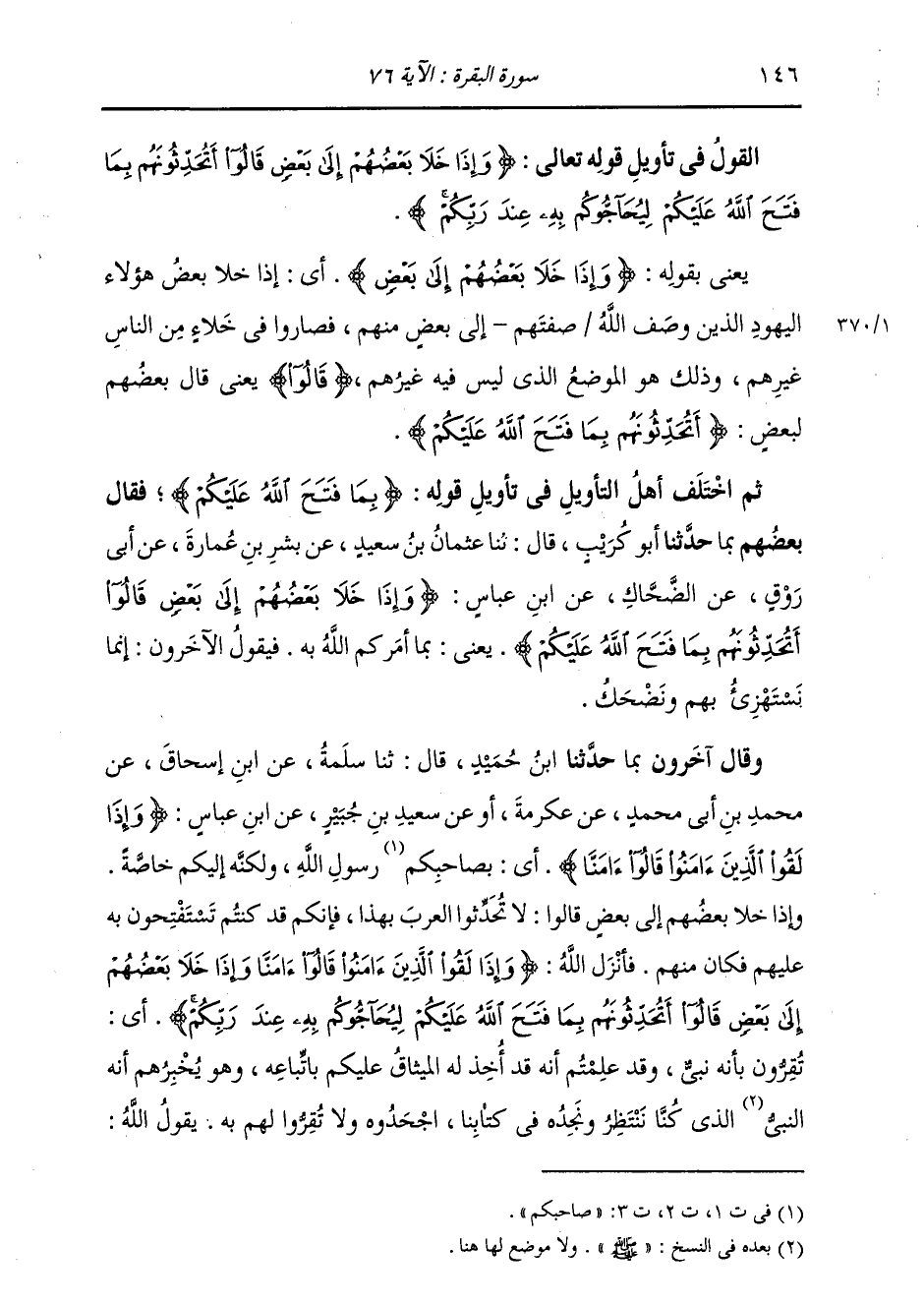 §الْقَوْلُ فِي تَأْوِيلِ قَوْلِهِ تَعَالَى: {وَإِذَا خَلَا بَعْضُهُمْ إِلَى بَعْضٍ قَالُوا أَتُحَدِّثُونَهُمْ بِمَا فَتَحَ اللَّهُ عَلَيْكُمْ لِيُحَاجُّوكُمْ بِهِ عِنْدَ رَبِّكُمْ} [البقرة: 76]