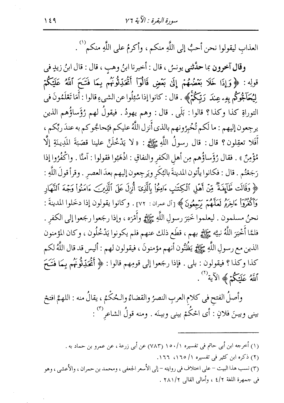 وَقَالَ آخَرُونَ بِمَا حَدَّثَنِي يُونُسُ، قَالَ: أَخْبَرَنَا ابْنُ وَهْبٍ، قَالَ: قَالَ ابْنُ زَيْدٍ: فِي قَوْلِهِ: {وَإِذَا خَلَا بَعْضُهُمْ إِلَى بَعْضٍ قَالُوا أَتُحَدِّثُونَهُمْ بِمَا فَتَحَ اللَّهُ عَلَيْكُمْ لِيُحَاجُّوكُمْ بِهِ عِنْدَ رَبِّكُمْ} [البقرة: 76] قَالَ: كَانُوا إِذَا سُئِلُوا عَنِ الشَّيْءِ قَالُوا: أَمَا تَعْلَمُونَ فِي التَّوْرَاةِ كَذَا وَكَذَا؟ قَالُوا: بَلَى. قَالَ: وَهُمْ يَهُودٌ، فَيَقُولُ لَهُمْ رُؤَسَاؤُهُمُ الَّذِينَ يَرْجِعُونَ إِلَيْهِمْ: مَا لَكُمْ تُخْبِرُونَهُمْ بِالَّذِي أَنْزَلَ اللَّهُ عَلَيْكُمْ فَيُحَاجُّوكُمْ بِهِ عِنْدَ رَبِّكُمْ أَفَلَا تَعْقِلُونَ؟ قَالَ: قَالَ رَسُولُ اللَّهِ صَلَّى اللهُ عَلَيْهِ وَسَلَّمَ: «§لَا يَدْخُلَنَّ عَلَيْنَا قَصَبَةَ الْمَدِينَةِ إِلَّا مُؤْمِنٌ» فَقَالَ رُؤَسَاؤُهُمْ مِنْ أَهْلِ الْكُفْرِ وَالنِّفَاقِ: اذْهَبُوا فَقُولُوا آمَنَّا، وَاكْفُرُوا إِذَا رَجَعْتُمْ. قَالَ: فَكَانُوا يَأْتُونَ الْمَدِينَةَ بِالْبَكَرِ وَيَرْجِعُونَ إِلَيْهِمْ بَعْدَ الْعَصْرِ. وَقَرَأَ قَوْلَ اللَّهِ: {وَقَالَتْ طَائِفَةٌ مِنْ أَهْلِ الْكِتَابِ آمِنُوا بِالَّذِي أُنْزِلَ عَلَى الَّذِينَ آمَنُوا وَجْهَ النَّهَارِ وَاكْفُرُوا آخِرَهُ لَعَلَّهُمْ يَرْجِعُونَ} [آل عمران: 72] وَكَانُوا يَقُولُونَ إِذَا دَخَلُوا الْمَدِينَةَ: نَحْنُ مُسْلِمُونَ، لِيَعْلَمُوا خَبَرَ رَسُولِ اللَّهِ صَلَّى اللهُ عَلَيْهِ وَسَلَّمَ وَأَمْرَهُ؛ وَإِذَا رَجَعُوا، رَجَعُوا إِلَى الْكُفْرِ. فَلَمَّا أَخْبَرَ اللَّهُ نَبِيَّهُ صَلَّى اللهُ عَلَيْهِ وَسَلَّمَ بِهِمْ، قَطَعَ ذَلِكَ عَنْهُمْ فَلَمْ يَكُونُوا يَدْخُلُونَ. وَكَانَ الْمُؤْمِنُونَ الَّذِينَ مَعَ رَسُولِ اللَّهِ صَلَّى اللهُ عَلَيْهِ وَسَلَّمَ يَظُنُّونَ أَنَّهُمْ مُؤْمِنُونَ، فَيَقُولُونَ لَهُمْ: أَلَيْسَ قَدْ قَالَ اللَّهُ لَكُمْ كَذَا وَكَذَا؟ فَيَقُولُونَ: بَلَى. فَإِذَا رَجَعُوا إِلَى قَوْمِهِمْ {قَالُوا أَتُحَدِّثُونَهُمْ بِمَا فَتَحَ اللَّهُ عَلَيْكُمْ} [البقرة: 76] الْآيَةُ وَأَصْلُ الْفَتْحِ فِي كَلَامِ الْعَرَبِ: النَّصْرُ وَالْقَضَاءُ وَالْحُكْمُ يُقَالُ مِنْهُ: اللَّهُمَّ افْتَحْ بَيْنِي وَبَيْنَ فُلَانٍ: أَيِ احْكُمْ بَيْنِي وَبَيْنَهُ، وَمِنْهُ قَوْلُ الشَّاعِرِ