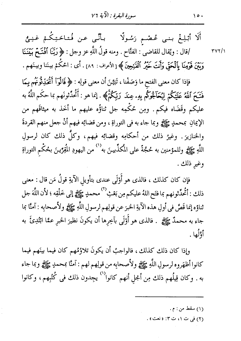 قَالَ: وَيُقَالُ لِلْقَاضِي: الْفَتَّاحُ، وَمِنْهُ قَوْلُ اللَّهِ عَزَّ وَجَلَّ: {رَبَّنَا افْتَحْ بَيْنَنَا وَبَيْنَ قَوْمِنَا بِالْحَقِّ وَأَنْتَ خَيْرُ الْفَاتِحِينَ} [الأعراف: 89] أَيِ احْكُمْ بَيْنَنَا وَبَيْنَهُمْ. فَإِذَا كَانَ مَعْنَى الْفَتْحِ مَا وَصَفْنَا، تَبَيَّنَ أَنَّ مَعْنَى قَوْلِهِ: {قَالُوا أَتُحَدِّثُونَهُمْ بِمَا فَتَحَ اللَّهُ عَلَيْكُمْ لِيُحَاجُّوكُمْ بِهِ عِنْدَ رَبِّكُمْ} [البقرة: 76] إِنَّمَا هُوَ أَتُحَدِّثُونَهُمْ بِمَا حَكَمَ اللَّهُ بِهِ عَلَيْكُمْ وَقَضَاهُ فِيكُمْ، وَمِنْ حُكْمِهِ جَلَّ ثَنَاؤُهُ عَلَيْهِمْ مَا أَخَذَ بِهِ مِيثَاقَهُمْ مِنَ الْإِيمَانِ بِمُحَمَّدٍ صَلَّى اللهُ عَلَيْهِ وَسَلَّمَ، وَبِمَا جَاءَ بِهِ فِي التَّوْرَاةِ، وَمِنْ قَضَائِهِ فِيهِمْ أَنْ جَعَلَ مِنْهُمُ الْقِرَدَةَ وَالْخَنَازِيرَ، وَغَيْرُ ذَلِكَ مِنْ أَحْكَامِهِ وَقَضَائِهِ فِيهِمْ، وَكُلُّ ذَلِكَ كَانَ لِرَسُولِ اللَّهِ صَلَّى اللهُ عَلَيْهِ وَسَلَّمَ وَلِلْمُؤْمِنِينَ بِهِ حُجَّةٌ عَلَى الْمُكَذِّبِينَ مِنَ الْيَهُودِ الْمُقِرِّينَ بِحُكْمِ التَّوْرَاةِ وَغَيْرِ ذَلِكَ. فَإِنْ كَانَ كَذَلِكَ فَالَّذِي هُوَ أَوْلَى عِنْدِي بِتَأْوِيلِ الْآيَةِ قَوْلُ مَنْ قَالَ: مَعْنَى ذَلِكَ: {أَتُحَدِّثُونَهُمْ بِمَا فَتَحَ اللَّهُ عَلَيْكُمْ} [البقرة: 76] مِنْ بَعْثِ مُحَمَّدٍ صَلَّى اللهُ عَلَيْهِ وَسَلَّمَ إِلَى خَلْقِهِ؛ لِأَنَّ اللَّهَ جَلَّ ثَنَاؤُهُ إِنَّمَا قَصَّ فِي أَوَّلِ هَذِهِ الْآيَةِ الْخَبَرَ عَنْ قَوْلِهِمْ لِرَسُولِ اللَّهِ صَلَّى اللهُ عَلَيْهِ وَسَلَّمَ وَلِأَصْحَابِهِ: آمَنَّا بِمَا جَاءَ بِهِ مُحَمَّدٌ صَلَّى اللهُ عَلَيْهِ وَسَلَّمَ؛ فَالَّذِي هُوَ أَوْلَى بِآخِرِهَا أَنْ يَكُونَ نَظِيرَ الْخَبَرِ عَمَّا ابْتُدِئَ بِهِ أَوَّلُهَا. وَإِذَا كَانَ ذَلِكَ كَذَلِكَ، فَالْوَاجِبُ أَنْ يَكُونَ تَلَاوُمُهُمْ كَانَ فِيمَا بَيْنَهُمْ فِيمَا كَانُوا أَظْهَرُوهُ لِرَسُولِ اللَّهِ صَلَّى اللهُ عَلَيْهِ وَسَلَّمَ وَلِأَصْحَابِهِ مِنْ قَوْلِهِمْ لَهُمْ: آمَنَّا بِمُحَمَّدٍ صَلَّى اللهُ عَلَيْهِ وَسَلَّمَ وَبِمَا جَاءَ بِهِ، وَكَانَ قِيلُهُمْ ذَلِكَ مِنْ أَجْلِ أَنَّهُمْ يَجِدُونَ ذَلِكَ فِي كُتُبِهِمْ وَكَانُوا