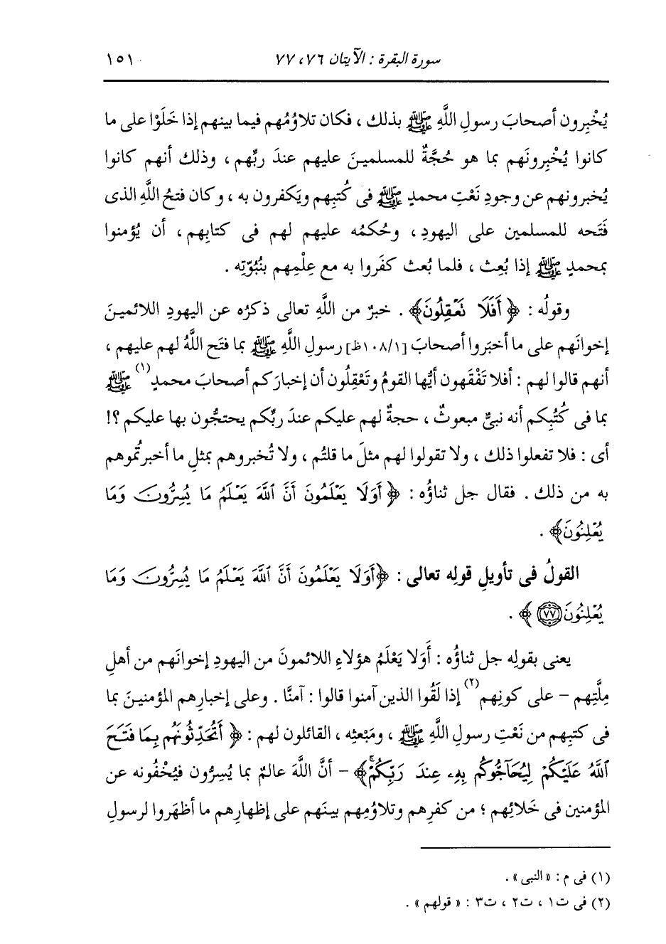 §يَعْنِي بِقَوْلِهِ جَلَّ ثَنَاؤُهُ: {أَوَلَا يَعْلَمُونَ أَنَّ اللَّهَ يَعْلَمُ مَا يُسِرُّونَ وَمَا يُعْلِنُونَ} [البقرة: 77] أَوَلَا يَعْلَمُ هَؤُلَاءِ اللَّائِمُونَ مِنَ الْيَهُودِ إِخْوَانَهُمْ مِنْ أَهْلِ مِلِّتِهِمْ، عَلَى كَوْنِهِمْ إِذَا لَقُوا الَّذِينَ آمَنُوا قَالُوا آمَنَّا، وَعَلَى إِخْبَارِهِمُ الْمُؤْمِنِينَ بِمَا فِي كُتُبهِمْ مِنْ نَعْتِ رَسُولِ اللَّهِ صَلَّى اللهُ عَلَيْهِ وَسَلَّمَ، وَمَبْعَثِهِ، الْقَائِلُونَ لَهُمْ: {أَتُحَدِّثُونَهُمْ بِمَا فَتَحَ اللَّهُ عَلَيْكُمْ لِيُحَاجُّوكُمْ بِهِ عِنْدَ رَبِّكُمْ} [البقرة: 76] أَنَّ اللَّهَ عَالِمٌ بِمَا يُسِرُّونَ فَيُخْفُونَهُ عَنِ الْمُؤْمِنِينَ فِي خَلَائِهِمْ مِنْ كُفْرِهِمْ وَتَلَاوُمِهِمْ بَيْنَهُمْ عَلَى إِظْهَارِهِمْ مَا أَظْهَرُوا لِرَسُولِ