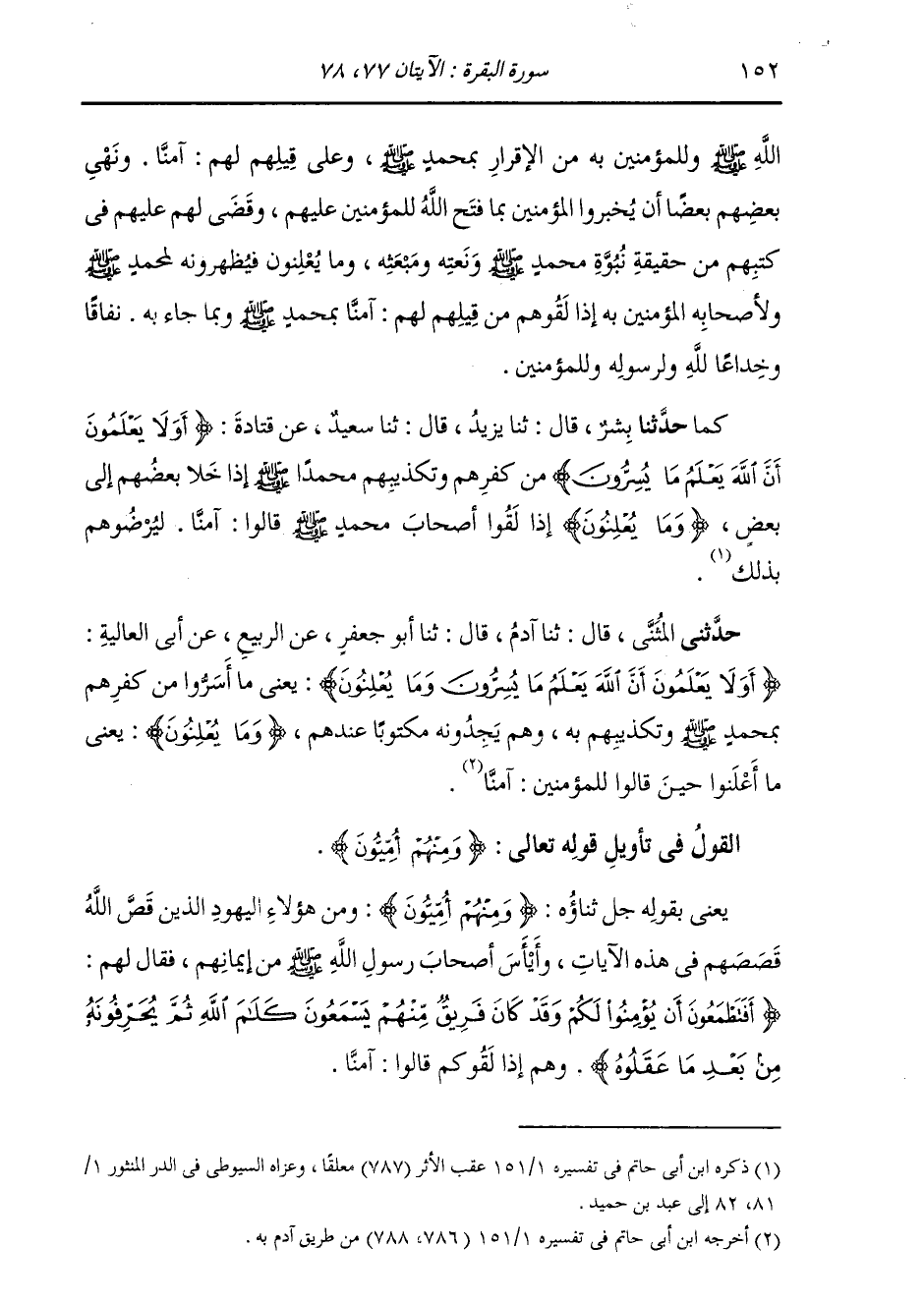 §يَعْنِي بِقَوْلِهِ جَلَّ ثَنَاؤُهُ: {وَمِنْهُمْ أُمِّيُّونَ} [البقرة: 78] وَمِنْ هَؤُلَاءِ الْيَهُودِ الَّذِينَ قَصَّ اللَّهُ قَصَصَهُمْ فِي هَذِهِ الْآيَاتِ، وَأَيْأَسَ أَصْحَابَ رَسُولِ اللَّهِ صَلَّى اللهُ عَلَيْهِ وَسَلَّمَ مِنْ إِيمَانِهِمْ، فَقَالَ لَهُمْ: {أَفَتَطْمَعُونَ أَنْ يُؤْمِنُوا لَكُمْ وَقَدْ كَانَ فَرِيقٌ مِنْهُمْ يَسْمَعُونَ كَلَامَ اللَّهِ ثُمَّ يُحَرِّفُونَهُ مِنْ بَعْدِ مَا عَقَلُوهُ} [البقرة: 75] وَهُمْ إِذَا لَقُوكُمْ قَالُوا آمَنَّا