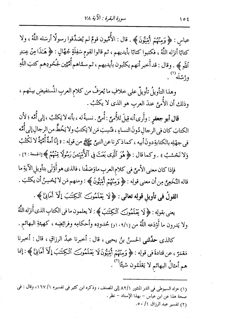 §الْقَوْلُ فِي تَأْوِيلِ قَوْلِهِ تَعَالَى: {لَا يَعْلَمُونَ الْكِتَابَ إِلَّا أَمَانِيَّ} [البقرة: 78] يَعْنِي بِقَوْلِهِ: {لَا يَعْلَمُونَ الْكِتَابَ} [البقرة: 78] لَا يَعْلَمُونَ مَا فِي الْكِتَابِ الَّذِي أَنْزَلَهُ اللَّهُ وَلَا يَدْرُونَ مَا أَوْدَعَهُ اللَّهُ مِنْ حُدُودِهِ وَأَحْكَامِهِ وَفَرَائِضِهِ كَهَيْئَةِ الْبَهَائِمِ