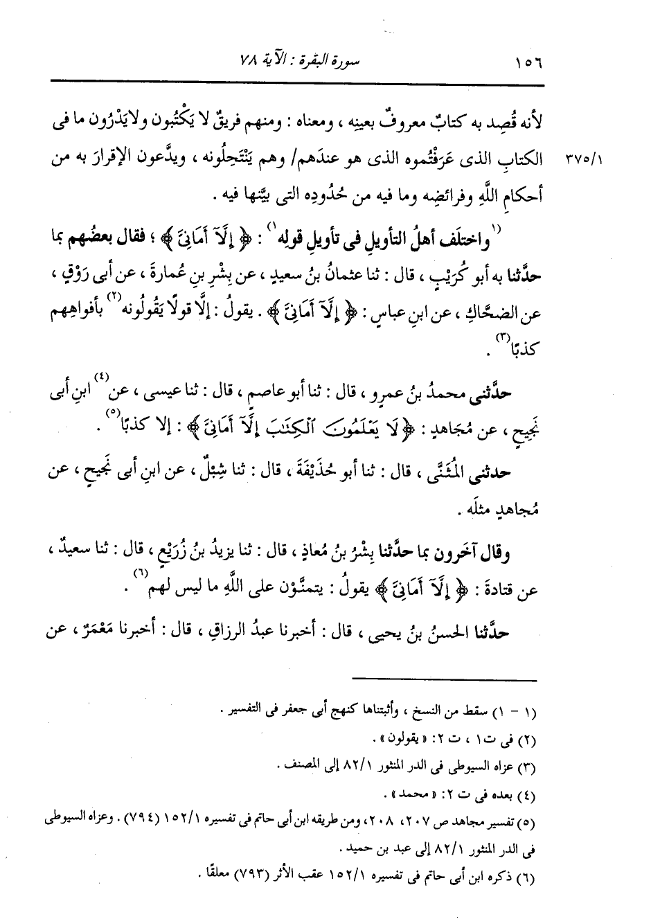 حَدَّثَنِي مُحَمَّدُ بْنُ عَمْرٍو، قَالَ: ثنا أَبُو عَاصِمٍ، قَالَ: ثنا عِيسَى، عَنِ ابْنِ أَبِي نَجِيحٍ، عَنْ مُجَاهِدٍ: " {§لَا يَعْلَمُونَ الْكِتَابَ إِلَّا أَمَانِيَّ} [البقرة: 78] إِلَّا كَذِبًا " حَدَّثَنِي الْمُثَنَّى، قَالَ: ثنا أَبُو حُذَيْفَةَ، قَالَ: ثنا شِبْلٌ، عَنِ ابْنِ أَبِي نَجِيحٍ، عَنْ مُجَاهِدٍ مِثْلَهُ