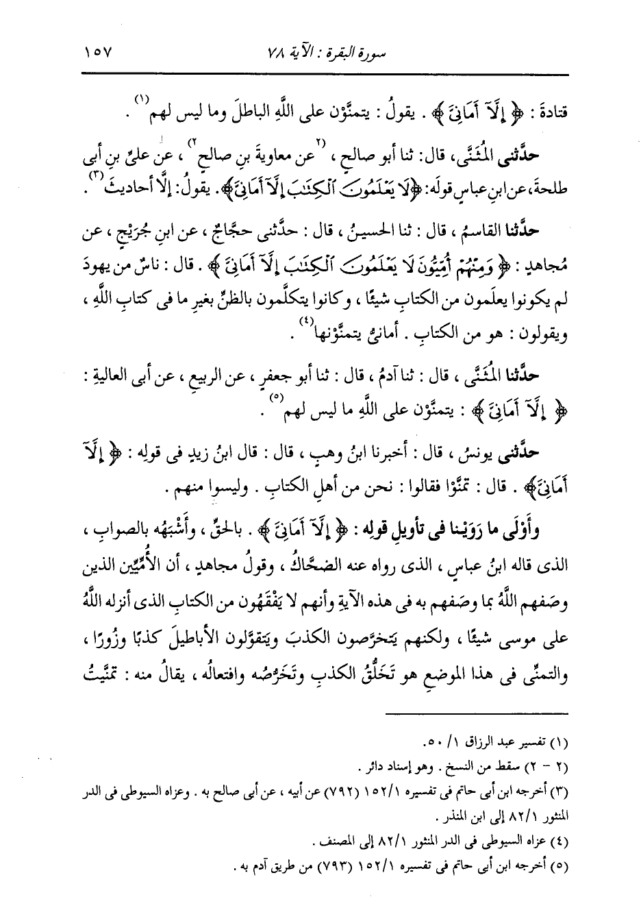 حَدَّثَنِي الْمُثَنَّى، قَالَ: ثنا أَبُو صَالِحٍ، عَنْ عَلِيِّ بْنِ أَبِي طَلْحَةَ، عَنِ ابْنِ عَبَّاسٍ: " قَوْلُهُ: {§لَا يَعْلَمُونَ الْكِتَابَ إِلَّا أَمَانِيَّ} [البقرة: 78] يَقُولُ: إِلَّا أَحَادِيثَ "
