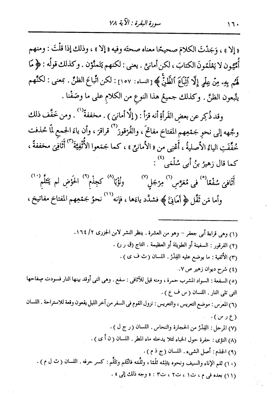 إِلَّا، وَجَدْتَ الْكَلَامَ صَحِيحًا مَعْنَاهُ صِحَّتُهُ وَفِيهِ إِلَّا؟ وَذَلِكَ إِذَا قُلْتَ: {وَمِنْهُمْ أُمِّيُّونَ لَا يَعْلَمُونَ الْكِتَابَ} [البقرة: 78] لَكِنْ أَمَانِيَّ، يَعْنِي لَكِنَّهُمْ يَتَمَنَّوْنَ، وَكَذَلِكَ قَوْلُهُ: {مَا لَهُمْ بِهِ مِنْ عِلْمٍ إِلَّا اتِّبَاعَ الظَّنِّ} [النساء: 157] لَكِنِ اتِّبَاعَ الظَّنِّ، بِمَعْنَى: لَكِنَّهُمْ يَتَّبِعُونَ الظَّنَّ، وَكَذَلِكَ جَمِيعُ هَذَا النَّوْعِ مِنَ الْكَلَامِ عَلَى مَا وَصَفْنَا. وَقَدْ ذُكِرَ عَنْ بَعْضِ الْقُرَّاءِ أَنَّهُ قَرَأَ: (إِلَّا أَمَانِيَ) مُخَفَّفَةً، وَمَنْ خَفَّفَ ذَلِكَ وَجَّهَهُ إِلَى نَحْوِ جَمْعِهِمُ الْمِفْتَاحَ مَفَاتِحَ، وَالْقُرْقُورُ قَرَاقِرٌ، وَإِنَّ يَاءَ الْجَمْعِ لَمَّا حُذِفَتْ خُفِّفَتِ الْيَاءُ الْأَصْلِيَّةُ، أَعْنِي مِنَ الْأَمَانِيِّ، كَمَا جَمَعُوا الْأُثْفِيَّةَ أَثَافِي مُخَفَّفَةً، كَمَا قَالَ زُهَيْرُ بْنُ أَبِي سُلْمَى: