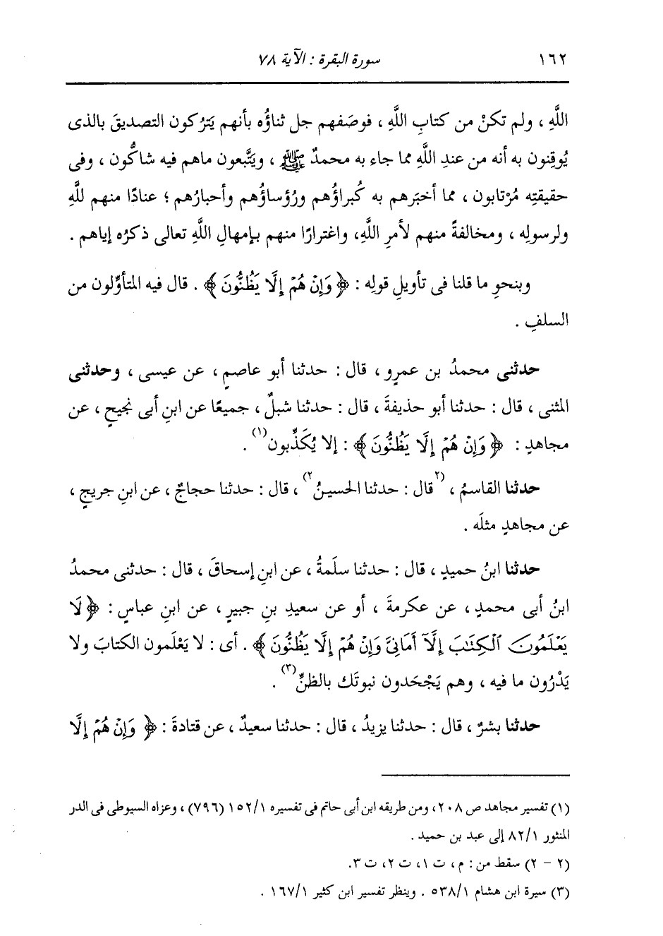 حَدَّثَنِي مُحَمَّدُ بْنُ عَمْرٍو، قَالَ: حَدَّثَنَا أَبُو عَاصِمٍ، قَالَ: حَدَّثَنَا عِيسَى، عَنِ ابْنِ أَبِي نَجِيحٍ، عَنْ مُجَاهِدٍ: " {§وَإِنْ هُمْ إِلَّا يَظُنُّونَ} [البقرة: 78] إِلَّا يَكْذِبُونَ " حَدَّثَنِي الْمُثَنَّى، قَالَ: حَدَّثَنَا أَبُو حُذَيْفَةَ، قَالَ: حَدَّثَنَا شِبْلٌ، عَنِ ابْنِ أَبِي نَجِيحٍ، عَنْ مُجَاهِدٍ، مِثْلَهُ حَدَّثَنَا الْقَاسِمُ، قَالَ: حَدَّثَنَا حَجَّاجٌ، عَنِ ابْنِ جُرَيْجٍ، عَنْ مُجَاهِدٍ، مِثْلَهُ