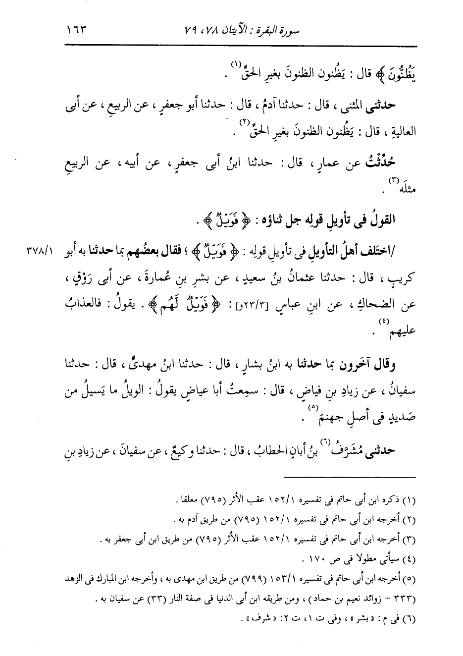 §الْقَوْلُ فِي تَأْوِيلِ قَوْلِهِ تَعَالَى: {فَوَيْلٌ لِلَّذِينَ يَكْتُبُونَ الْكِتَابَ بِأَيْدِيهِمْ ثُمَّ يَقُولُونَ هَذَا مِنْ عِنْدِ اللهِ لِيَشْتَرُوا بِهِ ثَمَنًا قَلِيلًا فَوَيْلٌ لَهُمْ مِمَّا كَتَبَتْ أَيْدِيهِمْ وَوَيْلٌ لَهُمْ مِمَّا يَكْسِبُونَ} [البقرة: 79]