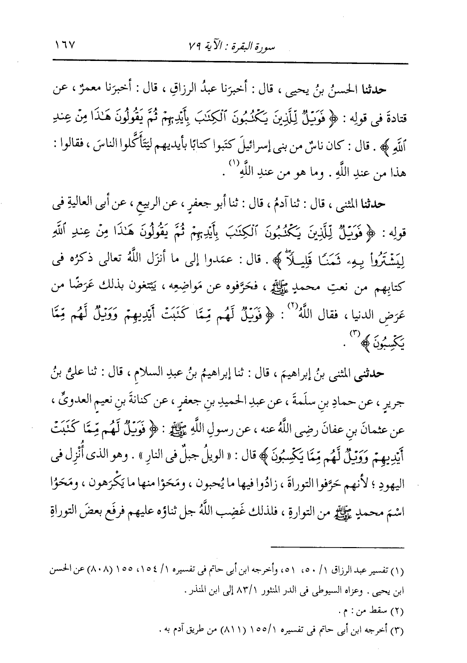 حَدَّثَنِي الْمُثَنَّى، قَالَ: ثنا آدَمَ، قَالَ: ثنا أَبُو جَعْفَرٍ، عَنِ الرَّبِيعِ، عَنْ أَبِي الْعَالِيَةِ: " قَوْلُهُ: {فَوَيْلٌ لِلَّذِينَ يَكْتُبُونَ الْكِتَابَ بِأَيْدِيهِمْ ثُمَّ يَقُولُونَ هَذَا مِنْ عِنْدِ اللَّهِ لِيَشْتَرُوا بِهِ ثَمَنًا قَلِيلًا} [البقرة: 79] قَالَ: §عَمَدُوا إِلَى مَا أَنْزَلَ اللَّهُ فِي كِتَابَهِمْ مِنْ نَعْتِ مُحَمَّدٍ صَلَّى اللهُ عَلَيْهِ وَسَلَّمَ، فَحَرَّفُوهُ عَنْ مَوَاضِعِهِ يَبْتَغُونَ بِذَلِكَ عَرَضًا مِنْ عَرَضِ الدُّنْيَا، فَقَالَ: {فَوَيْلٌ لَهُمْ مِمَّا كَتَبَتْ أَيْدِيهِمْ وَوَيْلٌ لَهُمْ مِمَّا يَكْسِبُونَ} [البقرة: 79] "