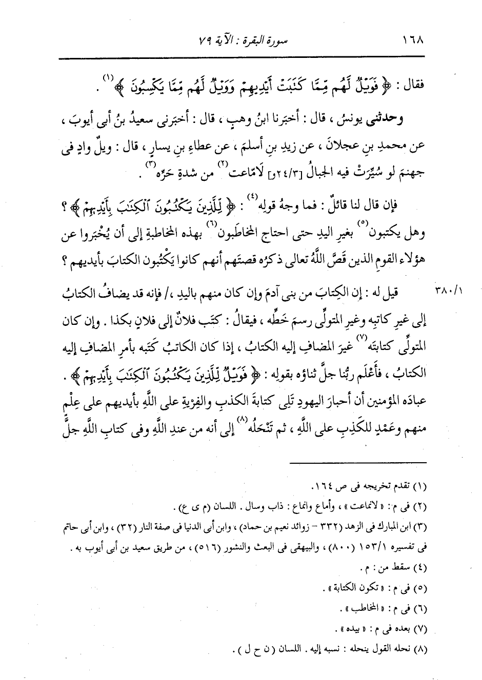 حَدَّثَنِي يُونُسُ، قَالَ: أَخْبَرَنَا ابْنُ وَهْبٍ، قَالَ: أَخْبَرَنِي سَعِيدُ بْنُ أَبِي أَيُّوبَ، عَنْ مُحَمَّدِ بْنِ عَجْلَانَ، عَنْ زَيْدِ بْنِ أَسْلَمَ، عَنْ عَطَاءِ بْنِ يَسَارٍ، قَالَ: " {§وَيْلٌ} [البقرة: 79] وَادٍ فِي جَهَنَّمَ لَوْ سُيِّرَتْ فِيهِ الْجِبَالُ لَانْمَاعَتْ مِنْ شِدَّةِ حَرِّهِ " قَالَ أَبُوجَعْفَرٍ: إِنْ قَالَ لَنَا قَائِلٌ: مَا وَجْهُ {فَوَيْلٌ لِلَّذِينَ يَكْتُبُونَ الْكِتَابَ بِأَيْدِيهِمْ} [البقرة: 79] ؟ وَهَلْ تَكُونُ الْكِتَابَةُ بِغَيْرِ الْيَدِ حَتَّى احْتَاجَ الْمُخَاطَبُ بِهَذِهِ الْمُخَاطَبَةِ إِلَى أَنْ يُخْبِرُوا عَنْ هَؤُلَاءِ الْقَوْمِ الَّذِينَ قَصَّ اللَّهُ قِصَّتَهُمْ أَنَّهُمْ كَانُوا يَكْتُبُونَ الْكِتَابَ بِأَيْدِيهِمْ؟ قِيلَ لَهُ: إِنَّ الْكِتَابَ مِنْ بَنِي آدَمَ وَإِنْ كَانَ مِنْهُمْ بِالْيَدِ، فَإِنَّهُ قَدْ يُضَافُ الْكِتَابُ إِلَى غَيْرِ كَاتِبِهِ وَغَيْرِ الْمُتَوَلِّي رَسْمَ خَطِّهِ، فَيُقَالُ: كَتَبَ فُلَانٌ إِلَى فُلَانٍ بِكَذَا، وَإِنْ كَانَ الْمُتَوَلِّي كِتَابَتَهُ بِيَدِهِ غَيْرَ الْمُضَافِ إِلَيْهِ الْكِتَابُ، إِذَا كَانَ الْكَاتِبُ كَتَبَهُ بِأَمْرِ الْمُضَافِ إِلَيْهِ الْكِتَابُ. فَأَعْلَمَ رَبُّنَا بِقَوْلِهِ: {فَوَيْلٌ لِلَّذِينَ يَكْتُبُونَ الْكِتَابَ بِأَيْدِيهِمْ} [البقرة: 79] عِبَادَهُ الْمُؤْمِنِينَ أَنَّ أَحْبَارَ الْيَهُودِ تَلِي كِتَابَةَ الْكَذِبِ وَالْفِرْيَةِ عَلَى اللَّهِ بِأَيْدِيهِمْ عَلَى عِلْمٍ مِنْهُمْ وَعَمْدٍ لِلْكَذِبِ عَلَى اللَّهِ ثُمَّ تَنْحَلُهُ إِلَى أَنَّهُ مِنْ عِنْدِ اللَّهِ وَفِي كِتَابِ اللَّهِ -[169]- تَكَذُّبًا عَلَى اللَّهِ وَافْتِرَاءً عَلَيْهِ. فَنَفَى جَلَّ ثَنَاؤُهُ بِقَوْلِهِ: {يَكْتُبُونَ الْكِتَابَ بِأَيْدِيهِمْ} [البقرة: 79] أَنْ يَكُونَ وَلِيَ كِتَابَةَ ذَلِكَ بَعْضُ جُهَّالِهِمْ بِأَمْرِ عُلَمَائِهِمْ وَأَحْبَارِهِمْ. وَذَلِكَ نَظِيرُ قَوْلِ الْقَائِلِ: بَاعَنِي فُلَانٌ عَيْنَهُ كَذَا وَكَذَا، فَاشْتَرَى فُلَانٌ نَفْسَهُ كَذَا، يُرَادُ بِإِدْخَالِ النَّفْسِ وَالْعَيْنِ فِي ذَلِكَ نَفْيُ اللَّبْسِ عَنْ سَامِعِهِ أَنْ يَكُونَ الْمُتَوَلِّي بَيْعَ ذَلِكَ وَشِرَاءَهُ غَيْرُ الْمَوْصُوفِ بِهِ بِأَمْرِهِ، وَيُوجِبُ حَقِيقَةَ الْفِعْلِ لِلْمُخْبِرِ عَنْهُ؛ فَكَذَلِكَ قَوْلُهُ: {فَوَيْلٌ لِلَّذِينَ يَكْتُبُونَ الْكِتَابَ بِأَيْدِيهِمْ} [البقرة: 79]