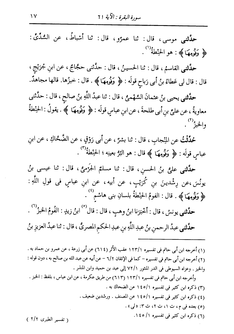 حَدَّثَنِي يَحْيَى بْنُ عُثْمَانَ السَّهْمِيُّ، قَالَ: ثنا عَبْدُ اللَّهِ بْنُ صَالِحٍ، قَالَ: حَدَّثَنِي مُعَاوِيَةُ، عَنْ عَلِيِّ بْنِ أَبِي طَلْحَةَ، عَنِ ابْنِ عَبَّاسٍ: " فِي قَوْلِهِ: {§وَفُومِهَا} [البقرة: 61] يَقُولُ: الْحِنْطَةُ وَالْخُبْزُ "
