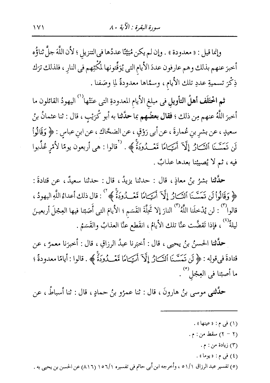 حَدَّثَنَا الْحَسَنُ بْنُ يَحْيَى، قَالَ: أَخْبَرَنَا عَبْدُ الرَّزَّاقِ، قَالَ: أَخْبَرَنَا مَعْمَرٌ، عَنْ قَتَادَةَ: " فِي قَوْلِهِ: {§لَنْ تَمَسَّنَا النَّارُ إِلَّا أَيَّامًا مَعْدُودَةً} [البقرة: 80] قَالُوا: أَيَّامًا مَعْدُودَةً بِمَا أَصَبْنَا فِي الْعِجْلِ "