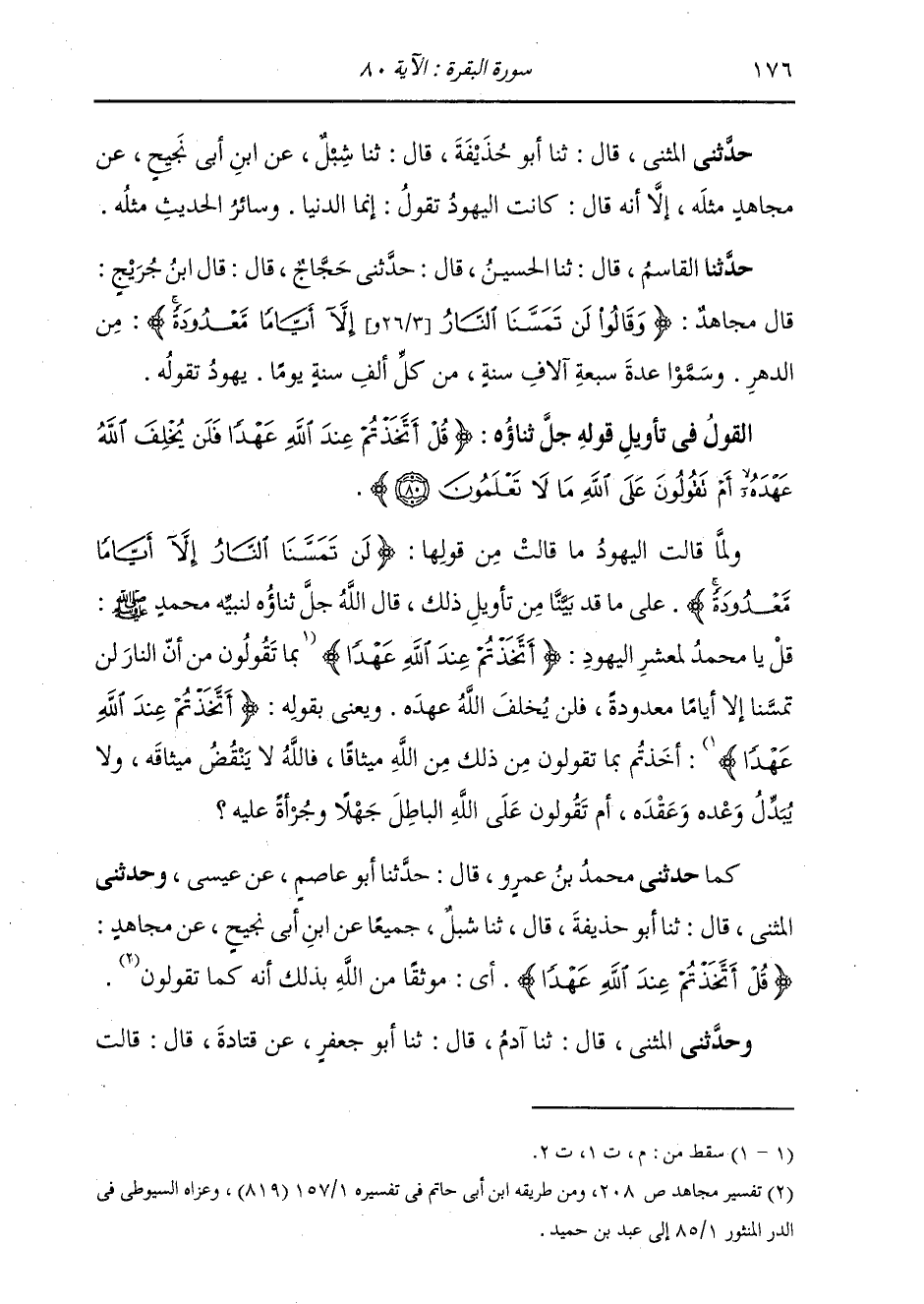 كَمَا حَدَّثَنَا مُحَمَّدُ بْنُ عَمْرٍو، قَالَ: حَدَّثَنَا أَبُو عَاصِمٍ، عَنْ عِيسَى، عَنِ ابْنِ أَبِي نَجِيحٍ، عَنْ مُجَاهِدٍ: " {§قُلْ أَتَّخَذْتُمْ عِنْدَ اللَّهِ عَهْدًا} [البقرة: 80] أَيْ مَوْثِقًا مِنَ اللَّهِ بِذَلِكَ أَنَّهُ كَمَا تَقُولُونَ " حَدَّثَنِي الْمُثَنَّى، قَالَ: ثنا أَبُو حُذَيْفَةَ، قَالَ: ثنا شِبْلٌ، عَنِ ابْنِ أَبِي نَجِيحٍ، عَنْ مُجَاهِدٍ، مِثْلَهُ