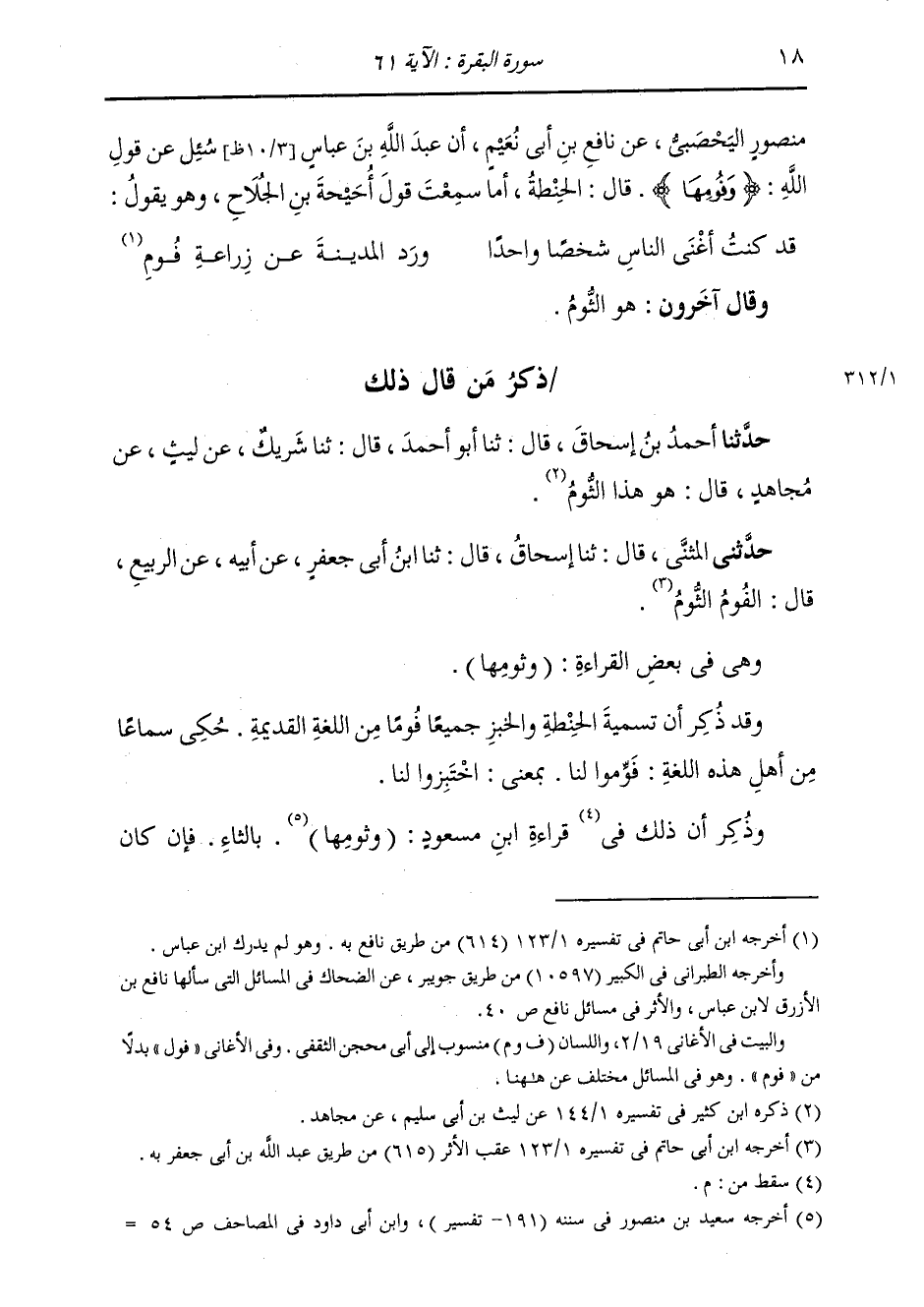 حَدَّثَنِي الْمُثَنَّى بْنُ إِبْرَاهِيمَ، قَالَ: ثنا إِسْحَاقُ، قَالَ: ثنا ابْنُ أَبِي جَعْفَرٍ، عَنْ أَبِيهِ، عَنِ الرَّبِيعِ، قَالَ: " §الْفُومُ: الثَّوْمُ «وَهُوَ فِي بَعْضِ الْقِرَاءَاتِ» وَثُومِهَا " وَقَدْ ذُكِرَ أَنَّ تَسْمِيَةَ الْحِنْطَةِ وَالْخُبْزِ جَمِيعًا فُومًا مِنَ اللُّغَةِ الْقَدِيمَةِ، حُكِيَ سَمَاعًا مِنْ أَهْلِ هَذِهِ اللُّغَةِ: فُومُوا لَنَا، بِمَعْنَى اخْتَبِزُوا لَنَا؛ وَذُكِرَ أَنَّ ذَلِكَ قِرَاءَةُ عَبْدِ اللَّهِ بْنِ مَسْعُودٍ «وَثُومِهَا» بِالثَّاءِ. فَإِنْ كَانَ -[19]- ذَلِكَ صَحِيحًا فَإِنَّهُ مِنَ الْحُرُوفِ الْمُبْدَلَةِ، كَقَوْلِهِمْ: وَقَعُوا فِي عَاثُورِ شَرٍّ وَعَافُورِ شَرٍّ، وَكَقَوْلِهِمْ لِلْأَثَافِي أَثَاثِي، وَلِلْمَغَافِيرِ مَغَاثِيرُ، وَمَا أَشْبَهَ ذَلِكَ مِمَّا تُقْلَبُ الثَّاءُ فَاءً وَالْفَاءُ ثَاءً لِتَقَارُبِ مَخْرَجِ الْفَاءِ مِنْ مَخْرَجِ الثَّاءِ. وَالْمَغَافِيرُ شَبِيهٌ بِالشَّيْءِ الْحُلْوِ يُشَبَّهُ بِالْعَسَلِ يَنْزِلُ مِنَ السَّمَاءِ حُلْوًا يَقَعُ عَلَى الشَّجَرِ وَنَحْوِهَا