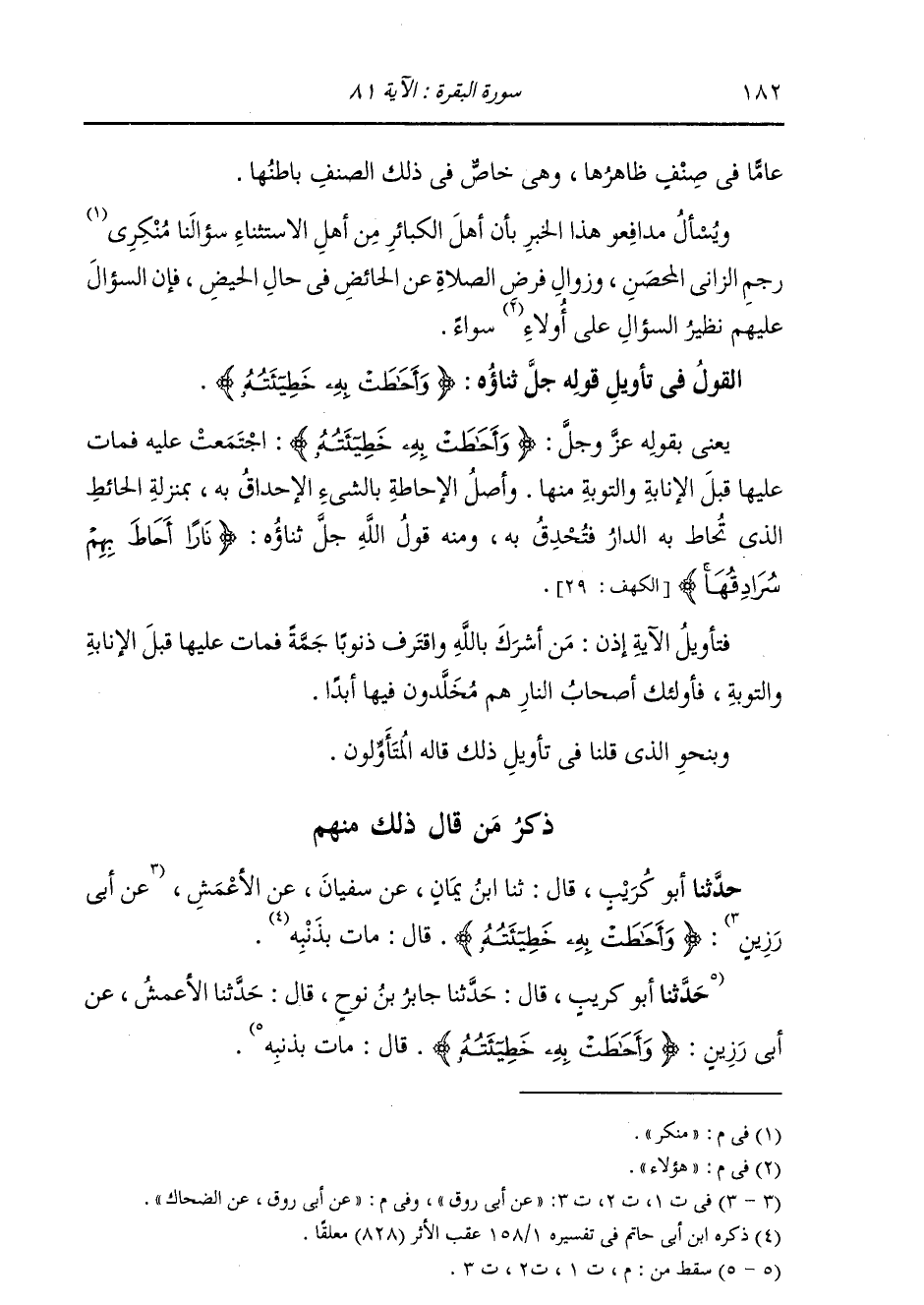 §الْقَوْلُ فِي تَأْوِيلِ قَوْلِهِ تَعَالَى: {وَأَحَاطَتْ بِهِ خَطِيئَتُهُ} [البقرة: 81] يَعْنِي بِقَوْلِهِ جَلَّ ثَنَاؤُهُ: {وَأَحَاطَتْ بِهِ خَطِيئَتُهُ} [البقرة: 81] اجْتَمَعَتْ عَلَيْهِ فَمَاتَ عَلَيْهَا قَبْلَ الْإِنَابَةِ وَالتَّوْبَةِ مِنْهَا. وَأَصْلُ الْإِحَاطَةِ بِالشَّيْءِ: الْإِحْدَاقُ بِهِ بِمَنْزِلَةِ الْحَائِطِ الَّذِي تُحَاطُ بِهِ الدَّارُ فَتُحْدِقُ بِهِ، وَمِنْهُ قَوْلُ اللَّهِ جَلَّ ثَنَاؤُهُ: {نَارًا أَحَاطَ بِهِمْ سُرَادِقُهَا} [الكهف: 29] . فَتَأْوِيلُ الْآيَةِ إِذًا: مَنْ أَشْرَكَ بِاللَّهِ وَاقْتَرَفَ ذُنُوبًا جَمَّةً فَمَاتَ عَلَيْهَا قَبْلَ الْإِنَابَةِ وَالتَّوْبَةِ، فَأُولَئِكَ أَصْحَابُ النَّارِ هُمْ فِيهَا مُخَلَّدُونَ أَبَدًا. وَبِنَحْوِ الَّذِي قُلْنَا فِي تَأْوِيلِ ذَلِكَ، قَالَ الْمُتَأَوِّلُونَ