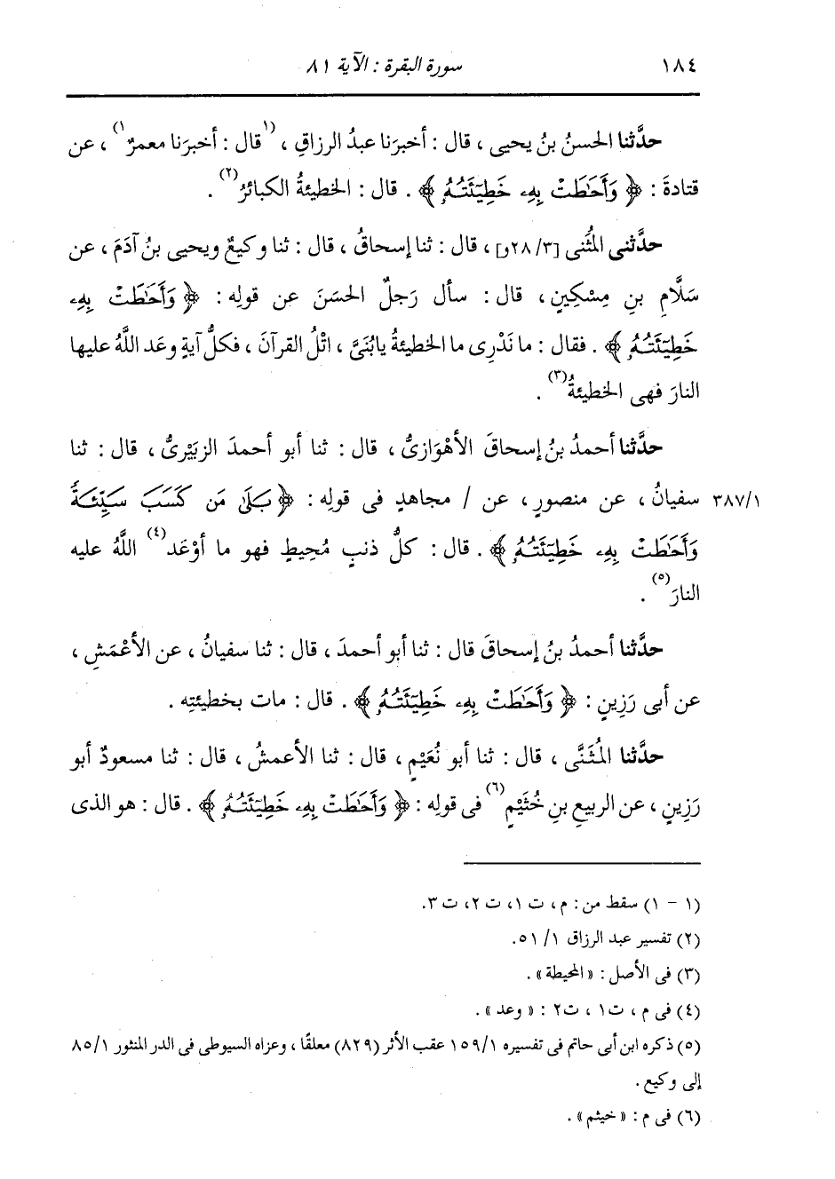 حَدَّثَنِي الْمُثَنَّى، قَالَ: ثنا أَبُو نُعَيْمٍ، قَالَ: ثنا الْأَعْمَشُ، قَالَ: ثنا مَسْعُودُ أَبُو رَزِينٍ، عَنِ الرَّبِيعِ بْنِ خُثَيْمٍ: " فِي قَوْلِهِ: {وَأَحَاطَتْ بِهِ خَطِيئَتُهُ} [البقرة: 81] قَالَ: §هُوَ الَّذِي -[185]- يَمُوتُ عَلَى خَطِيئَتِهِ، قَبْلَ أَنْ يَتُوبَ "