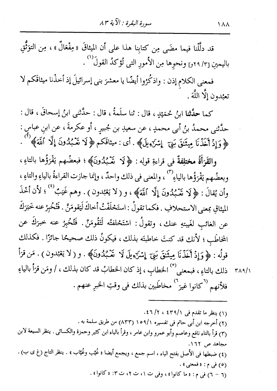 كَمَا حَدَّثَنِي بِهِ ابْنُ حُمَيْدٍ، قَالَ: ثنا سَلَمَةُ، قَالَ: حَدَّثَنِي ابْنُ إِسْحَاقَ، قَالَ: حَدَّثَنِي مُحَمَّدُ بْنُ أَبِي مُحَمَّدٍ، عَنْ سَعِيدِ بْنِ جُبَيْرٍ أَوْ عِكْرِمَةَ، عَنِ ابْنِ عَبَّاسٍ: " {§وَإِذْ أَخَذْنَا مِيثَاقَ بَنِي إِسْرَائِيلَ} [البقرة: 83] أَيْ مِيثَاقَكُمْ {لَا تَعْبُدُونَ إِلَّا اللَّهَ} [البقرة: 83] " قَالَ أَبُو جَعْفَرٍ: وَالْقِرَاءَةُ مُخْتَلِفَةٌ فِي قِرَاءَةِ قَوْلِهِ: {لَا تَعْبُدُونَ} [البقرة: 83] فَبَعْضُهُمْ يَقْرَؤُهَا بِالتَّاءِ، وَبَعْضُهُمْ يَقْرَؤُهَا بِالْيَاءِ، وَالْمَعْنَى فِي ذَلِكَ وَاحِدٌ. وَإِنَّمَا جَازَتِ الْقِرَاءَةُ بِالْيَاءِ وَالتَّاءِ وَأَنْ يُقَالَ: {لَا تَعْبُدُونَ} [البقرة: 83] وَ (لَا يَعْبُدُونَ) وَهُمْ غَيْبٌ؛ لِأَنَّ أَخْذَ الْمِيثَاقِ بِمَعْنَى الِاسْتِحْلَافِ، فَكَمَا تَقُولُ: اسْتَحْلَفْتَ أَخَاكَ لَيَقُومَنَّ، فَتُخْبِرُ عَنْهُ خَبَرَكَ عَنِ الْغَائِبِ لِغَيْبَتِهِ عَنْكَ، وَتَقُولُ: اسْتَحْلَفْتُهُ لَتَقُومَنَّ، فَتُخْبِرُ عَنْهُ خَبَرَكَ عَنِ الْمُخَاطَبِ؛ لِأَنَّكَ قَدْ كُنْتَ خَاطَبْتَهُ بِذَلِكَ، فَيَكُونُ ذَلِكَ صَحِيحًا جَائِزًا، فَكَذَلِكَ قَوْلُهُ: {وَإِذْ أَخَذْنَا مِيثَاقَ بَنِي إِسْرَائِيلَ لَا تَعْبُدُونَ إِلَّا اللَّهَ} [البقرة: 83] وَ (لَا يَعْبُدُونَ) مَنْ قَرَأَ ذَلِكَ بِالتَّاءِ فَمَعْنَى الْخِطَابِ إِذْ كَانَ الْخِطَابُ قَدْ كَانَ بِذَلِكَ، وَمَنْ قَرَأَ بِالْيَاءِ فَلِأَنَّهُمْ مَا كَانُوا مُخَاطَبِينَ بِذَلِكَ فِي وَقْتِ الْخَبَرِ عَنْهُمْ. -[189]- وَأَمَّا رَفْعُ لَا تَعْبُدُونَ فَبِالتَّاءِ الَّتِي فِي تَعْبُدُونَ، وَلَا يُنْصَبُ بِأَنْ الَّتِي كَانَتْ تَصْلُحُ أَنْ تَدْخُلَ مَعَ: {لَا تَعْبُدُونَ إِلَّا اللَّهَ} [البقرة: 83] لِأَنَّهَا إِذَا صَلَحَ دُخُولُهَا عَلَى فِعْلٍ فَحُذِفَتْ وَلَمْ تَدْخُلْ كَانَ وَجْهُ الْكَلَامِ فِيهِ الرَّفْعَ كَمَا قَالَ جَلَّ ثَنَاؤُهُ: {قُلْ أَفَغَيْرَ اللَّهِ تَأْمُرُونِّي أَعْبُدُ أَيُّهَا الْجَاهِلُونَ} [الزمر: 64] فَرَفَعَ أَعْبُدُ إِذْ لَمْ تَدْخُلْ فِيهَا أَنْ بِالْأَلْفِ الدَّالَّةِ عَلَى مَعْنَى الِاسْتِقْبَالِ. وَكَمَا قَالَ الشَّاعِرُ: