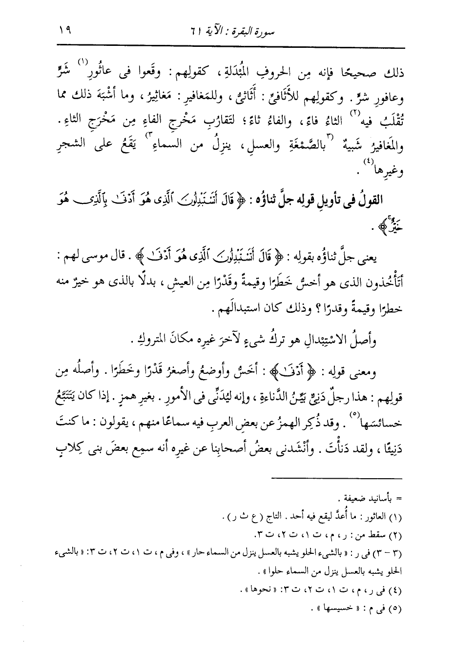 §الْقَوْلُ فِي تَأْوِيلِ قَوْلِهِ تَعَالَى: {قَالَ أَتَسْتَبْدِلُونَ الَّذِي هُوَ أَدْنَى بِالَّذِي هُوَ خَيْرٌ} [البقرة: 61] يَعْنِي بِقَوْلِهِ: {قَالَ أَتَسْتَبْدِلُونَ الَّذِي هُوَ أَدْنَى بِالَّذِي هُوَ خَيْرٌ} [البقرة: 61] قَالَ لَهُمْ مُوسَى: أَتَأْخُذُونَ الَّذِي هُوَ أَخَسُّ خَطَرًا وَقِيمَةً وَقَدْرًا مِنَ الْعَيْشِ، بَدَلًا بِالَّذِي هُوَ خَيْرٌ مِنْهُ خَطَرًا وَقِيمَةً وَقَدْرًا. وَذَلِكَ كَانَ اسْتِبْدَالَهُمْ. وَأَصْلُ الِاسْتِبْدَالِ: هُوَ تَرْكُ شَيْءٍ لِآخَرَ غَيْرِهِ مَكَانَ الْمَتْرُوكِ. وَمَعْنَى قَوْلِهِ: {أَدْنَى} [البقرة: 61] أَخَسُّ وَأَوْضَعُ وَأَصْغَرُ قَدْرًا وَخَطَرًا، وَأَصْلُهُ مِنْ قَوْلِهِمْ: هَذَا رَجُلٌ دَنِيٌّ بَيِّنُ الدَّنَاءَةِ، وَإِنَّهُ لَيُدْنِي فِي الْأُمُورِ بِغَيْرِ هَمْزٍ إِذَا كَانَ يَتَتَبَّعُ خَسِيسَهَا. وَقَدْ ذُكِرَ الْهَمْزُ عَنْ بَعْضِ الْعَرَبِ فِي ذَلِكَ سَمَاعًا مِنْهُمْ، يَقُولُونَ: مَا كُنْتَ دَنِيًّا وَلَقَدْ دَنَأْتَ. وَأَنْشَدَنِي بَعْضُ أَصْحَابِنَا عَنْ غَيْرِهِ أَنَّهُ سَمِعَ بَعْضَ بَنِي كِلَابٍ