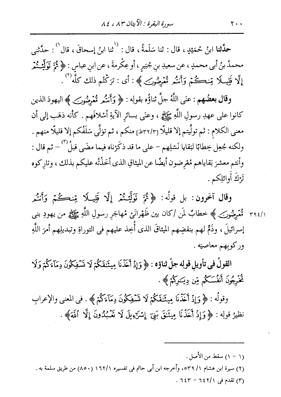 حَدَّثَنَا ابْنُ حُمَيْدٍ، قَالَ: ثنا سَلَمَةُ، قَالَ: ثنا ابْنُ إِسْحَاقَ، قَالَ: حَدَّثَنِي مُحَمَّدُ بْنُ أَبِي مُحَمَّدٍ، عَنْ سَعِيدِ بْنِ جُبَيْرٍ أَوْ عَنْ عِكْرِمَةَ، عَنِ ابْنِ عَبَّاسٍ: " {§ثُمَّ تَوَلَّيْتُمْ إِلَّا قَلِيلًا مِنْكُمْ وَأَنْتُمْ مُعْرِضُونَ} [البقرة: 83] أَيْ تَرَكْتُمْ ذَلِكَ كُلَّهُ " وَقَالَ بَعْضُهُمْ: عَنَى اللَّهُ جَلَّ ثَنَاؤُهُ بِقَوْلِهِ: {وَأَنْتُمْ مُعْرِضُونَ} [البقرة: 83] الْيَهُودَ الَّذِينَ كَانُوا عَلَى عَهْدِ رَسُولِ اللَّهِ صَلَّى اللهُ عَلَيْهِ وَسَلَّمَ، وَعَنَى بِسَائِرِ الْآيَةِ أَسْلَافَهُمْ؛ كَأَنَّهُ ذَهَبَ إِلَى أَنَّ مَعْنَى الْكَلَامِ: {ثُمَّ تَوَلَّيْتُمْ إِلَّا قَلِيلًا مِنْكُمْ} [البقرة: 83] ثُمَّ تَوَلَّى سَلَفُكُمْ إِلَّا قَلِيلًا مِنْهُمْ، وَلَكِنَّهُ جَعَلَ خِطَابًا لِبَقَايَا نَسْلِهِمْ عَلَى مَا ذَكَرْنَاهُ فِيمَا مَضَى قَبْلُ. ثُمَّ قَالَ: وَأَنْتُمْ يَا مَعْشَرَ بَقَايَاهُمْ مُعْرِضُونَ أَيْضًا عَنِ الْمِيثَاقَ الَّذِي أُخِذَ عَلَيْكُمْ بِذَلِكَ وَتَارِكُوهُ تَرْكَ أَوَائِلِكُمْ. وَقَالَ آخَرُونَ: بَلْ قَوْلُهُ: {ثُمَّ تَوَلَّيْتُمْ إِلَّا قَلِيلًا مِنْكُمْ وَأَنْتُمْ مُعْرِضُونَ} [البقرة: 83] خِطَابٌ لِمَنْ كَانَ بَيْنَ ظَهْرَانَيْ مُهَاجَرِ رَسُولِ اللَّهِ صَلَّى اللهُ عَلَيْهِ وَسَلَّمَ مِنْ يَهُودِ بَنِي إِسْرَائِيلَ، وَذَمٌّ لَهُمْ بِنَقْضِهِمُ الْمِيثَاقَ الَّذِي أُخِذَ عَلَيْهِمْ فِي التَّوْرَاةِ وَتَبْدِيلِهِمْ أَمْرَ اللَّهِ وَرُكُوبِهِمْ مَعَاصِيهِ