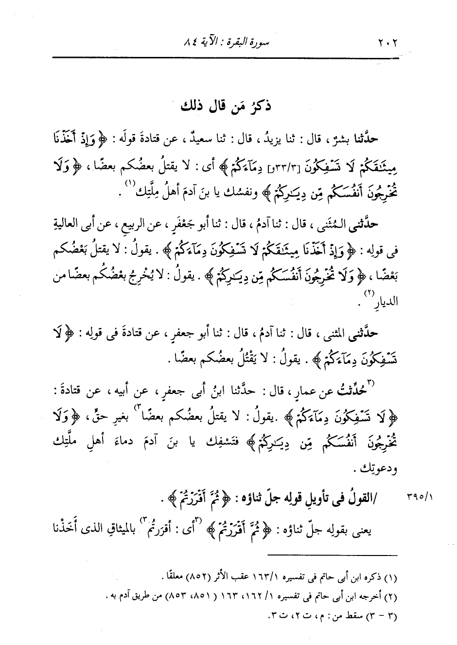 حَدَّثَنِي الْمُثَنَّى، قَالَ: ثنا آدَمُ، قَالَ: ثنا أَبُو جَعْفَرٍ، عَنْ قَتَادَةَ: " فِي قَوْلِهِ: {لَا تَسْفِكُونَ دِمَاءَكُمْ} [البقرة: 84] يَقُولُ: §لَا يَقْتُلُ بَعْضُكُمْ بَعْضًا بِغَيْرِ حَقٍّ {وَلَا تُخْرِجُونَ أَنْفُسَكُمْ مِنْ دِيَارِكُمْ} [البقرة: 84] فَتَسْفِكُ يَا ابْنَ آدَمَ دِمَاءَ أَهْلِ مِلَّتِكَ وَدَعْوَتِكَ "
