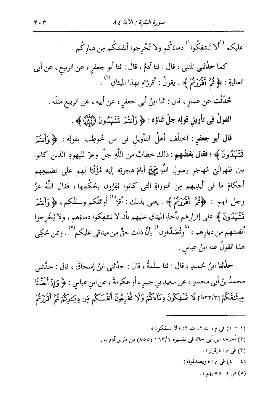 §الْقَوْلُ فِي تَأْوِيلِ قَوْلِهِ تَعَالَى: {وَأَنْتُمْ تَشْهَدُونَ} [البقرة: 84] اخْتَلَفَ أَهْلُ التَّأْوِيلِ فِيمَنْ خُوطِبَ بِقَوْلِهِ {وَأَنْتُمْ تَشْهَدُونَ} [البقرة: 84] فَقَالَ بَعْضُهُمْ: ذَلِكَ خِطَابٌ مِنَ اللَّهِ تَعَالَى ذِكْرُهُ لِلْيَهُودِ الَّذِينَ كَانُوا بَيْنَ ظَهْرَانَيْ مُهَاجَرِ رَسُولِ اللَّهِ صَلَّى اللهُ عَلَيْهِ وَسَلَّمَ أَيَّامَ هِجْرَتِهِ إِلَيْهِ مُؤَنِّبًا لَهُمْ عَلَى تَضْيِيعِ أَحْكَامِ مَا فِي أَيْدِيهِمْ مِنَ التَّوْرَاةِ الَّتِي كَانُوا يُقِرُّونَ بِحُكْمِهَا، فَقَالَ اللَّهُ تَعَالَى لَهُمْ: {ثُمَّ أَقْرَرْتُمْ} [البقرة: 84] يَعْنِي بِذَلِكَ إِقْرَارَ أَوَائِلِكُمْ وَسَلَفِكُمْ {وَأَنْتُمْ تَشْهَدُونَ} [البقرة: 84] عَلَى إِقْرَارِكُمْ بِأَخْذِ الْمِيثَاقِ عَلَيْهِمْ، بِأَنْ لَا يَسْفِكُوا دِمَاءَهُمْ، وَلَا يُخْرِجُوا أَنْفُسَهُمْ مِنْ دِيَارِهِمْ، وَيُصَدِّقُونَ بِأَنَّ ذَلِكَ حَقٌّ مِنْ مِيثَاقِي عَلَيْهِمْ. وَمِمَّنْ حُكِيَ مَعْنَى هَذَا الْقَوْلَ عَنْهُ ابْنُ عَبَّاسٍ