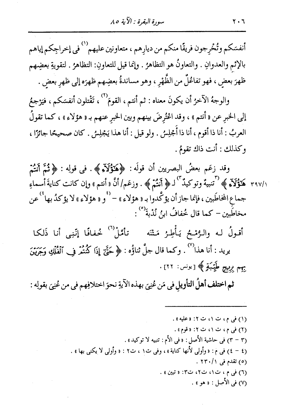 أَنْفُسَكُمْ وَتُخْرِجُونَ فَرِيقًا مِنْكُمْ مِنْ دِيَارِهِمْ} [البقرة: 85] مُتَعَاوِنِينَ عَلَيْهِمْ فِي إِخْرَاجِكُمْ إِيَّاهُمْ بِالْإِثْمِ وَالْعُدْوَانِ. وَالتَّعَاوُنُ: هُوَ التَّظَاهُرُ؛ وَإِنَّمَا قِيلَ: لِلتَّعَاوُنِ التَّظَاهُرُ، لِتَقْوِيَةِ بَعْضِهِمْ ظَهْرَ بَعْضٍ، فَهُوَ تَفَاعُلٌ مِنَ الظَّهْرِ، وَهُوَ مُسَانَدَةُ بَعْضِهِمْ ظَهْرَهُ إِلَى ظَهْرِ بَعْضٍ. وَالْوَجْهُ الْآخَرُ أَنْ يَكُونَ مَعْنَاهُ: ثُمَّ أَنْتُمْ قَوْمٌ تَقْتُلُونَ أَنْفُسَكُمْ؛ فَيَرْجِعُ إِلَى الْخَبَرِ عَنْ أَنْتُمْ، وَقَدِ اعْتَرَضَ بَيْنَهُمْ وَبَيْنَ الْخَبَرِ عَنْهُمْ بِهَؤُلَاءِ، كَمَا تَقُولُ الْعَرَبُ: أَنَا ذَا أَقُومُ، وَأَنَا هَذَا أَجْلِسُ، وَإِذْ قِيلَ: أَنَا هَذَا أَجْلِسُ كَانَ صَحِيحًا جَائِزًا، كَذَلِكَ أَنْتَ ذَاكَ تَقُومُ. وَقَدْ زَعَمَ بَعْضُ الْبَصْرِيِّينَ أَنَّ قَوْلَهُ هَؤُلَاءِ فِي قَوْلِهِ: {ثُمَّ أَنْتُمْ هَؤُلَاءِ} [البقرة: 85] تَنْبِيهٌ وَتَوْكِيدٌ لِأَنْتُمْ، وَزَعَمَ أَنَّ أَنْتُمْ وَإِنْ كَانَتْ كِنَايَةَ أَسْمَاءِ جِمَاعِ الْمُخَاطَبِينَ، فَإِنَّمَا جَازَ أَنْ يُؤَكَّدُوا بِهَؤُلَاءِ وَأُولَاءِ، لِأَنَّهَا كِنَايَةٌ عَنِ الْمُخَاطَبِينَ، كَمَا قَالَ خُفَافُ بْنُ نُدْبَةَ: