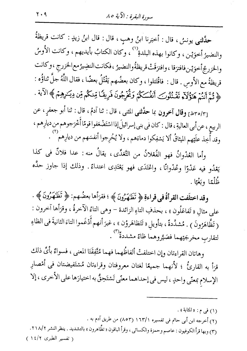 وَقَالَ آخَرُونَ بِمَا حَدَّثَنِي بِهِ الْمُثَنَّى، قَالَ: ثنا آدَمَ، قَالَ: ثنا أَبُو جَعْفَرٍ، عَنِ الرَّبِيعِ، عَنْ أَبِي الْعَالِيَةِ، قَالَ: «§كَانَ فِي بَنِي إِسْرَائِيلَ إِذَا اسْتُضْعِفُوا قَوْمًا أَخْرَجُوهُمْ مِنْ دِيَارِهِمْ، وَقَدْ أُخِذَ عَلَيْهِمُ الْمِيثَاقُ أَنْ لَا يَسْفِكُوا دِمَاءَهُمْ وَلَا يُخْرِجُوا أَنْفُسُهُمْ مِنْ دِيَارِهِمْ» وَأَمَّا الْعُدْوَانُ فَهُوَ الْفُعْلَانُ مِنَ التَّعَدِّي، يُقَالُ مِنْهُ: عَدَا فُلَانٌ فِي كَذَا عَدْوًا وَعُدْوَانًا، وَاعْتَدَى يَعْتَدِيَ اعْتِدَاءٍ، وَذَلِكَ إِذَا جَاوَزَ حَدَّهُ ظُلْمًا وَبَغْيًا وَقَدِ اخْتَلَفَ الْقُرَّاءُ فِي قِرَاءَةِ: {تَظَاهَرُونَ} [البقرة: 85] فَقَرَأَهَا بَعْضُهُمْ: {تَظَاهَرُونَ} [البقرة: 85] ، عَلَى مِثَالِ تَفَاعَلُونَ فَحَذَفَ التَّاءَ الزَّائِدَةَ وَهِيَ التَّاءُ الْآخِرَةُ. وَقَرَأَهَا آخَرُونَ: (تَظَّاهَرُونَ) فَشَدَّدَ بِتَأْوِيلِ {تَظَاهَرُونَ} [البقرة: 85] غَيْرَ أَنَّهُمْ أَدْغَمُوا التَّاءَ الثَّانِيَةَ فِي الظَّاءِ لِتَقَارُبِ مَخْرَجَيْهِمَا فَصَيَّرُوهُمَا ظَاءً مُشَدَّدَةً. وَهَاتَانِ الْقِرَاءَتَانِ وَإِنِ اخْتَلَفَتْ أَلْفَاظُهُمَا فَإِنَّهُمَا مُتَّفِقَتَا الْمَعْنَى، فَسَوَاءٌ بِأَيِّ ذَلِكَ قَرَأَ الْقَارِئُ لِأَنَّهُمَا جَمِيعًا لُغَتَانِ مَعْرُوفَتَانِ وَقِرَاءَتَانِ مُسْتَفِيضَتَانِ فِي أَمْصَارِ الْإِسْلَامِ بِمَعْنَى وَاحِدٍ لَيْسَ فِي إِحْدَاهُمَا مَعْنَى تَسْتَحِقُّ بِهِ اخْتِيَارَهَا عَلَى الْأُخْرَى إِلَّا -[210]- أَنْ يَخْتَارَ مُخْتَارٌ تَظَّاهَرُونَ الْمُشَدَّدَةَ طَلَبًا مِنْهُ تَتِمَّةَ الْكَلِمَةِ