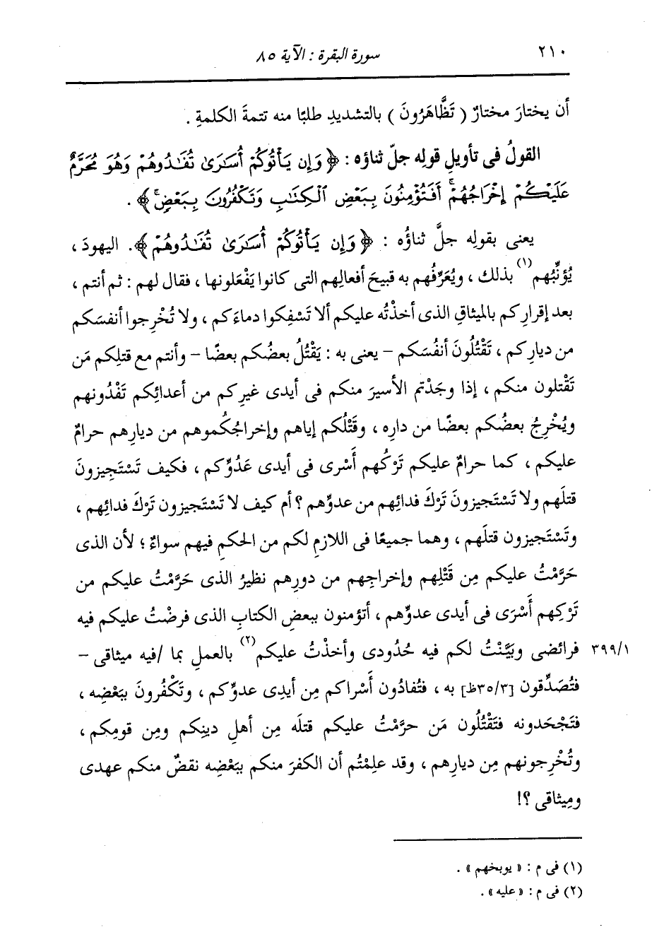 §الْقَوْلُ فِي تَأْوِيلِ قَوْلِهِ تَعَالَى: {وَإِنْ يَأْتُوكُمْ أُسَارَى تُفَادُوهُمْ وَهُوَ مُحَرَّمٌ عَلَيْكُمْ إِخْرَاجُهُمْ أَفَتُؤْمِنُونَ بِبَعْضِ الْكِتَابِ وَتَكْفُرُونَ بِبَعْضٍ} [البقرة: 85] يَعْنِي بِقَوْلِهِ جَلَّ ثَنَاؤُهُ: {وَإِنْ يَأْتُوكُمْ أُسَارَى تُفَادُوهُمْ} [البقرة: 85] الْيَهُودُ يُوَبِّخُهُمْ بِذَلِكَ، وَيُعَرِّفُهُمْ بِهِ قَبِيحَ أَفْعَالِهِمُ الَّتِي كَانُوا يَفْعَلُونَهَا. فَقَالَ لَهُمْ: ثُمَّ أَنْتُمْ بَعْدَ إِقْرَارِكُمْ بِالْمِيثَاقِ الَّذِي أَخَذْتُهُ عَلَيْكُمْ أَنْ لَا تَسْفِكُوا دِمَاءَكُمْ وَلَا تُخْرِجُوا أَنْفُسَكُمْ مِنْ دِيَارِكُمْ {تَقْتُلُونَ أَنْفُسَكُمْ} [البقرة: 85] يَعْنِي بِهِ يَقْتُلُ بَعْضُكُمْ بَعْضًا، وَأَنْتُمْ مَعَ قَتْلِكُمْ مَنْ تَقْتُلُونَ مِنْكُمْ إِذَا وَجَدْتُمُ الْأَسِيرَ مِنْكُمْ فِي أَيْدِي غَيْرِكُمْ مِنْ أَعْدَائِكُمْ تَفْدُونَهُ وَيُخْرِجُ بَعْضُكُمْ بَعْضًا مِنْ دِيَارِهِ. وَقَتْلُكُمْ إِيَّاهُمْ وَإِخْرَاجُكُمْ لَهُمْ مِنْ دِيَارِهِمْ حَرَامٌ عَلَيْكُمْ وَتَرْكُهُمْ أَسْرَى فِي أَيْدِي عَدُوِّكُمْ، فَكَيْفَ تَسْتَجِيزُونَ قَتْلَهُمْ وَلَا تَسْتَجِيزُونَ تَرْكَ فِدَائِهِمْ مِنْ عَدُوِّهِمْ؟ أَمْ كَيْفَ لَا تَسْتَجِيزُونَ تَرْكَ فِدَائِهِمْ وَتَسْتَجِيزُونَ قَتْلَهُمْ؟ وَهُمْ جَمِيعًا فِي اللَّازِمِ لَكُمْ مِنَ الْحُكْمِ فِيهِمْ سَوَاءٌ؛ لِأَنَّ الَّذِي حَرَّمْتُ عَلَيْكُمْ مِنْ قَتْلِهِمْ وَإِخْرَاجِهِمْ مِنْ دُورِهِمْ نَظِيرُ الَّذِي حَرَّمْتُ عَلَيْكُمْ مِنْ تَرْكِهِمْ أَسْرَى فِي أَيْدِي عَدُوِّهِمْ {أَفَتُؤْمِنُونَ بِبَعْضِ الْكِتَابِ} [البقرة: 85] الَّذِي فَرَضْتُ عَلَيْكُمْ فِيهِ فَرَائِضِي وَبَيَّنْتُ لَكُمْ فِيهِ حُدُودِي وَأَخَذْتُ عَلَيْهِ بِالْعَمَلِ بِمَا فِيهِ مِيثَاقِي فَتُصَدِّقُونَ بِهِ، فَتُفَادُونَ أَسْرَاكُمْ مِنْ أَيْدِي عَدُوِّكُمْ؛ وَتَكْفُرُونَ بِبَعْضِهِ فَتَجْحَدُونَهُ فَتَقْتُلُونَ مَنْ حَرَّمْتُ عَلَيْكُمْ قَتْلَهُ مِنْ أَهْلِ دِينِكُمْ وَمِنْ قَوْمِكُمْ، وَتُخْرِجُونَهُمْ مِنْ دِيَارِهِمْ؟ وَقَدْ عَلِمْتُمْ أَنَّ الْكُفْرَ مِنْكُمْ بِبَعْضِهِ نَقْضٌ مِنْكُمْ عَهْدِي وَمِيثَاقِي