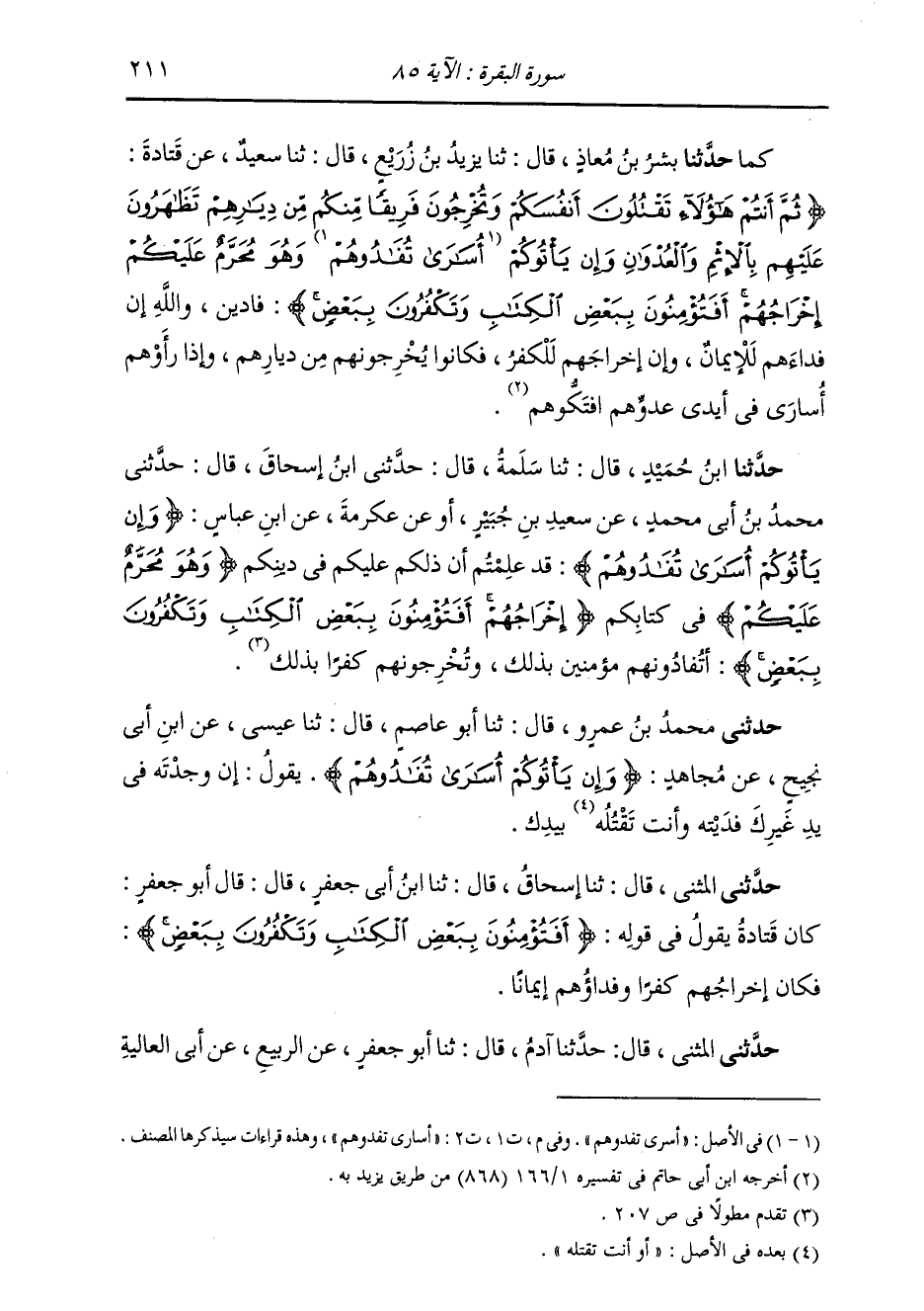 كَمَا حَدَّثَنَا بِشْرُ بْنُ مُعَاذٍ، قَالَ: ثنا يَزِيدُ بْنُ زُرَيْعٍ، قَالَ: ثنا سَعِيدٌ، عَنْ قَتَادَةَ: " {§ثُمَّ أَنْتُمْ هَؤُلَاءِ تَقْتُلُونَ أَنْفُسَكُمْ وَتُخْرِجُونَ فَرِيقًا مِنْكُمْ مِنْ دِيَارِهِمْ تَظَاهَرُونَ عَلَيْهِمْ بِالْإِثْمِ وَالْعُدْوَانِ وَإِنْ يَأْتُوكُمْ أُسَارَى تُفَادُوهُمْ وَهُوَ مُحَرَّمٌ عَلَيْكُمْ إِخْرَاجُهُمْ أَفَتُؤْمِنُونَ بِبَعْضِ الْكِتَابِ وَتَكْفُرُونَ بِبَعْضٍ} [البقرة: 85] فَادِينَ، وَاللَّهِ إِنَّ فِدَاءَهُمْ لَإِيمَانٌ وَإِنَّ إِخْرَاجَهُمْ لَكُفْرٌ، فَكَانُوا يُخْرِجُونَهُمْ مِنْ دِيَارِهِمْ، وَإِذَا رَأَوْهُمْ أُسَارَى فِي أَيْدِي عَدُوِّهِمْ افْتَكُّوهُمْ "
